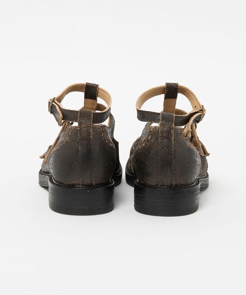 ヴィンテージライクな素材の風合いと、複数のストラップが連なるアッパーデザインが足元に存在感をプラス。