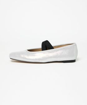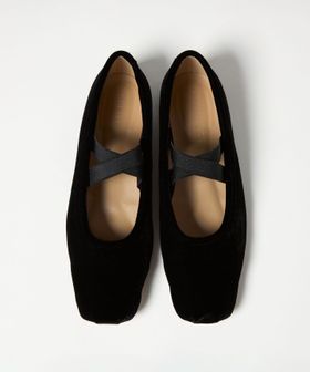 シンプルなスクエアトゥのフラットシューズにクロスベルトを付けた一足。