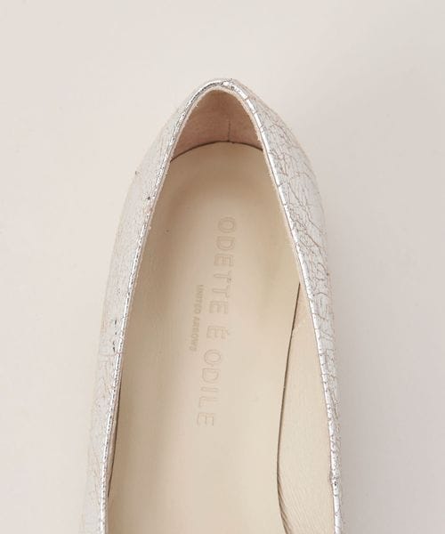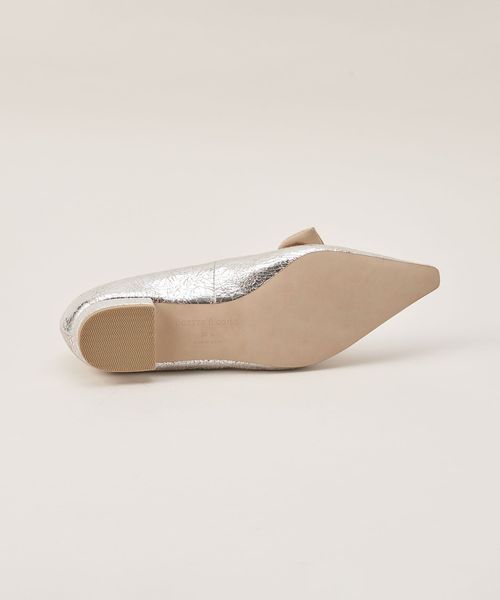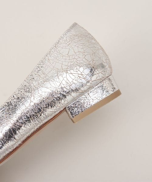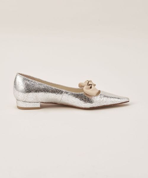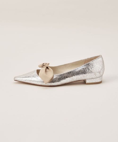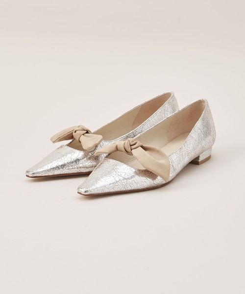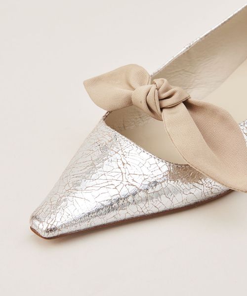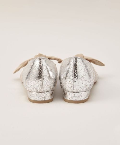 シルバーはクラッキング風加工の箔素材のアッパーに生地のリボン。