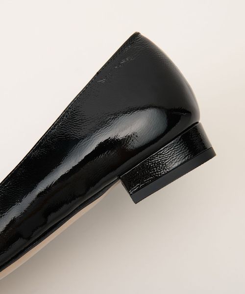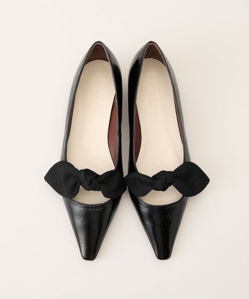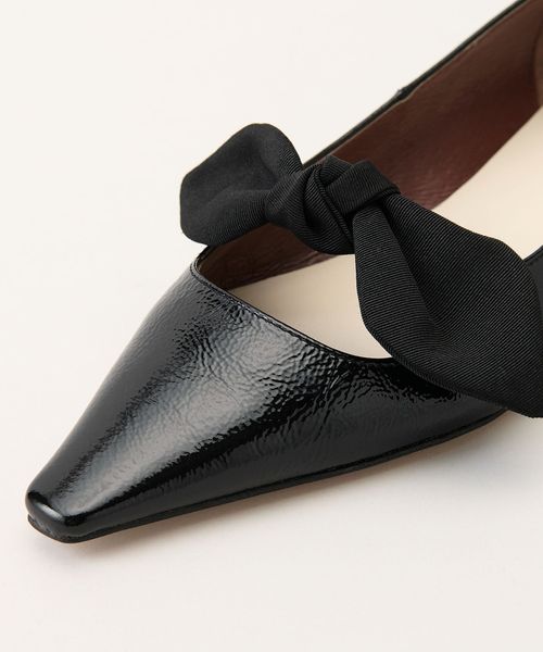 ブラックはややシボ感のあるエナメル素材のアッパーに生地のリボン。