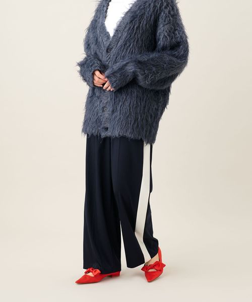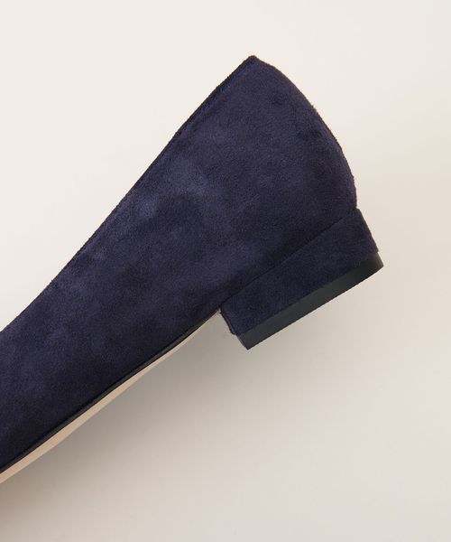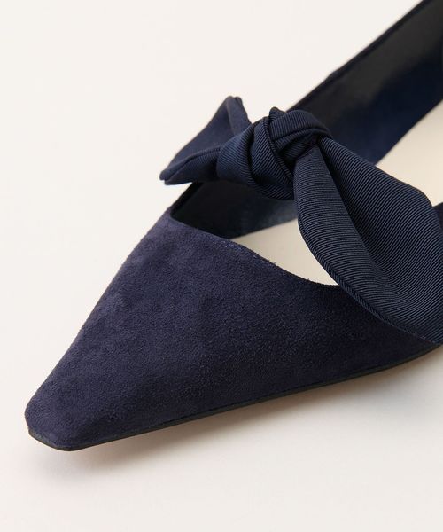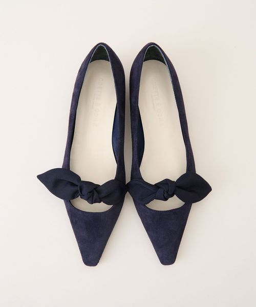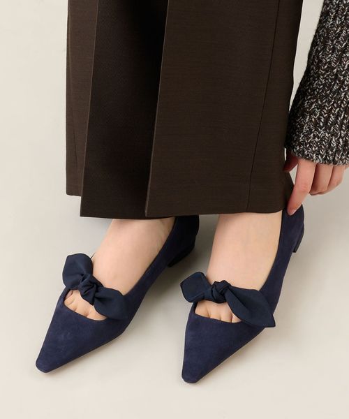 ネイビーは起毛素材のアッパーに生地のリボン。
