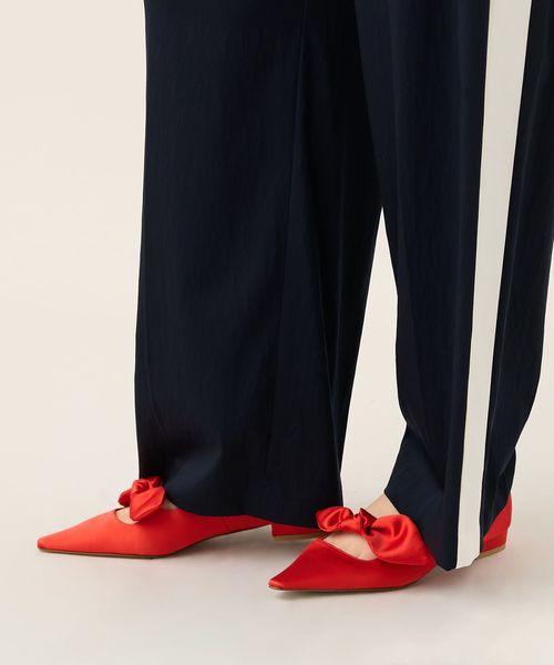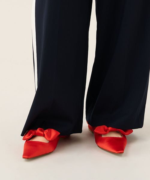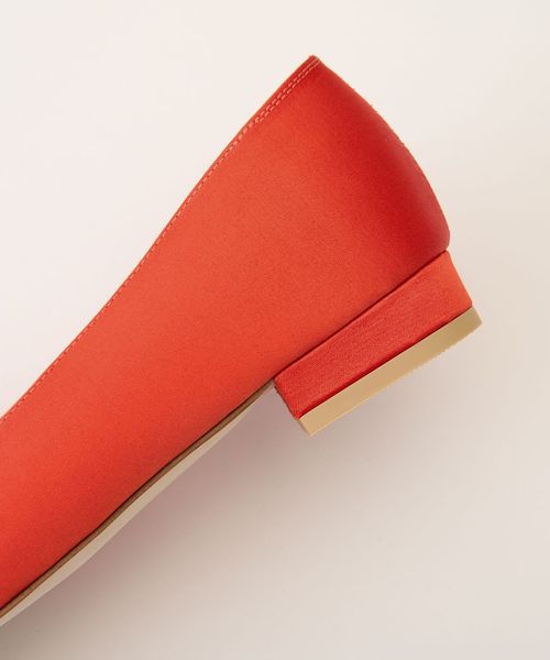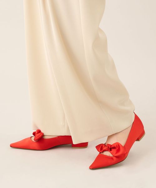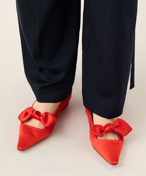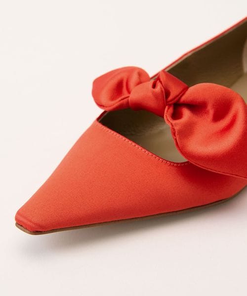 レッドはアッパーとリボンどちらも滑らかで上品な光沢感のあるサテン生地。