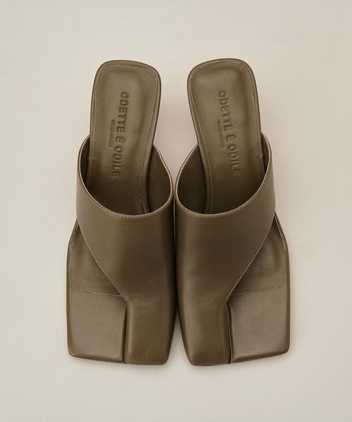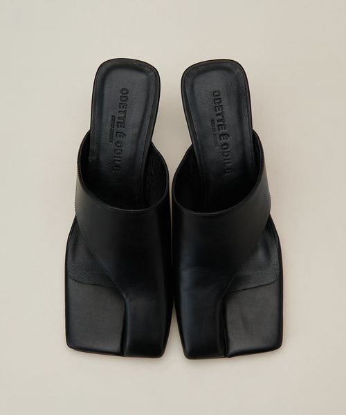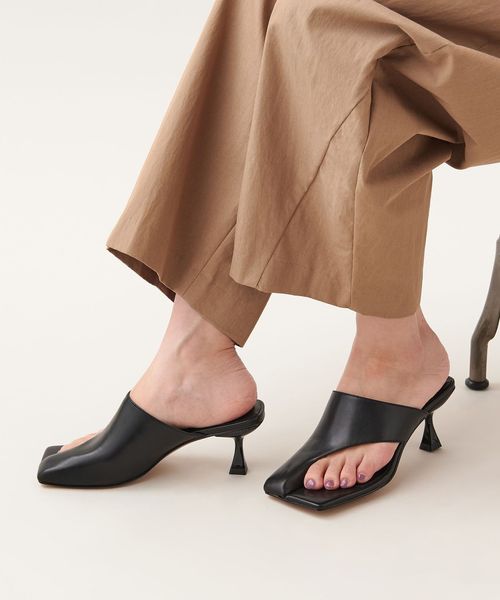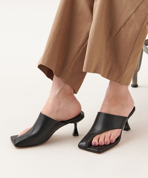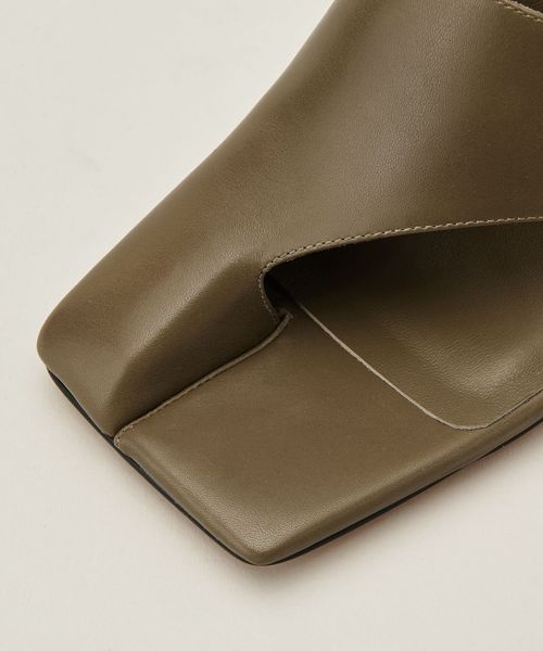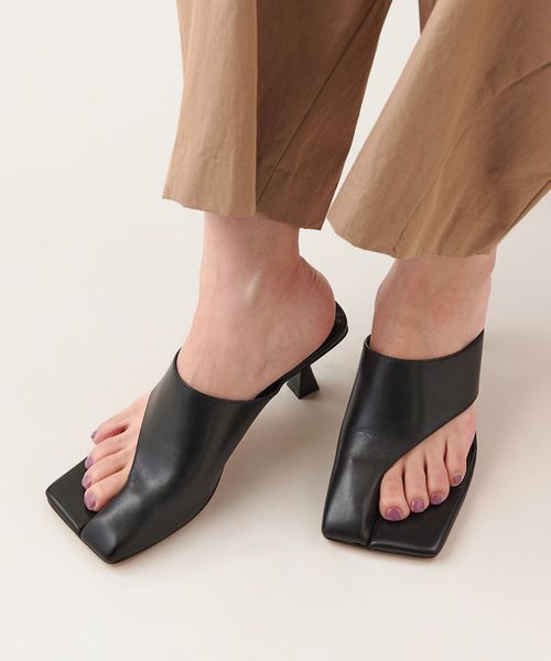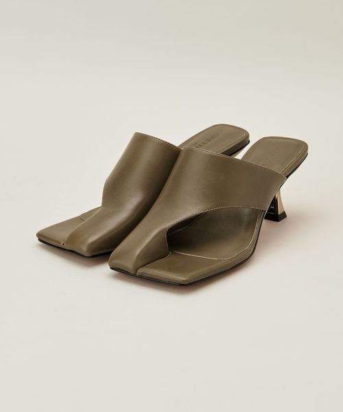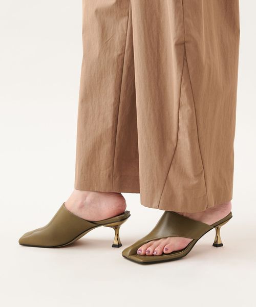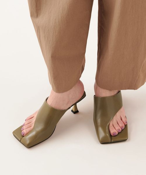 ワイドなスクエアトゥにメタリックヒールがアクセントのサムカバーサンダル。