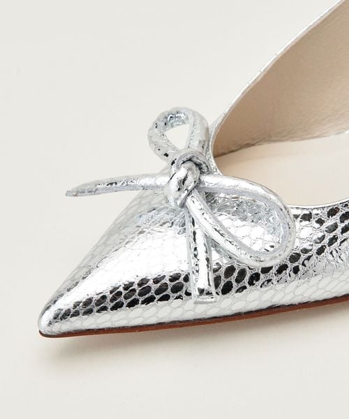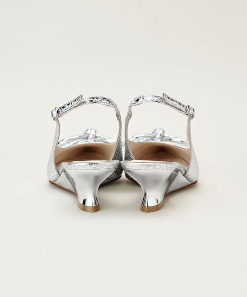 浅めのラインにふくらみのある袋状の革紐リボンをあしらったバックベルトパンプス。