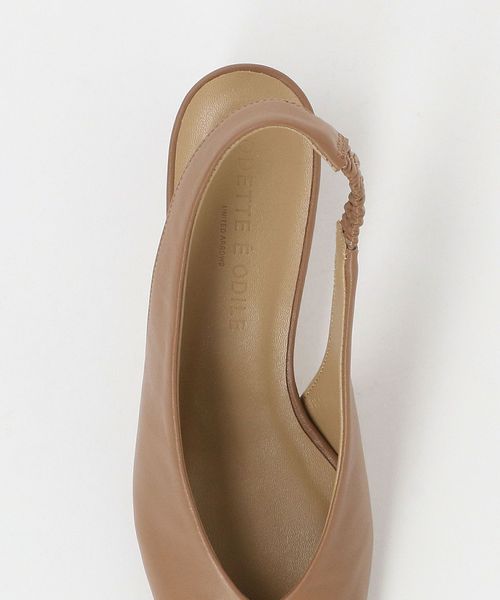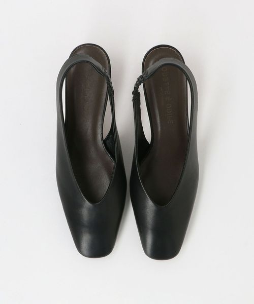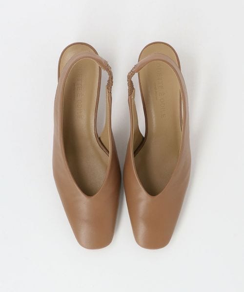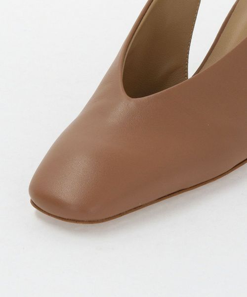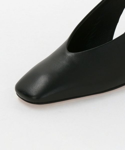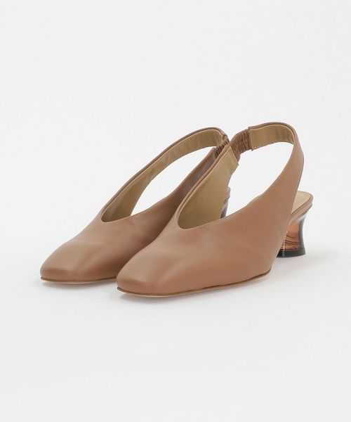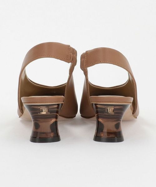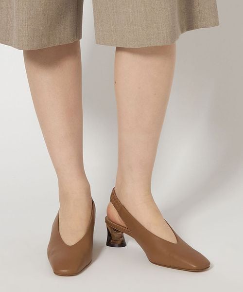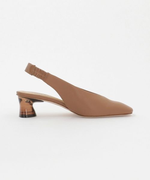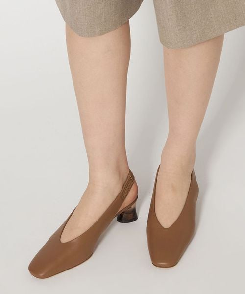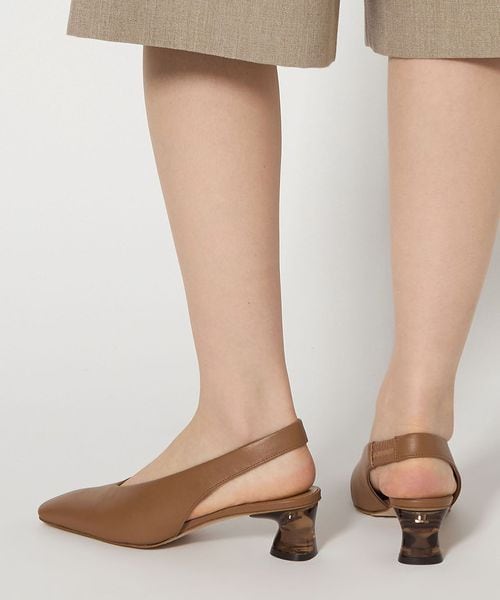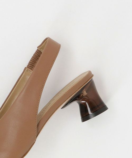 ソフトなスクエア木型に、透明感のあるカラーヒールを合わせたバックストラップパンプス。