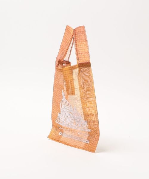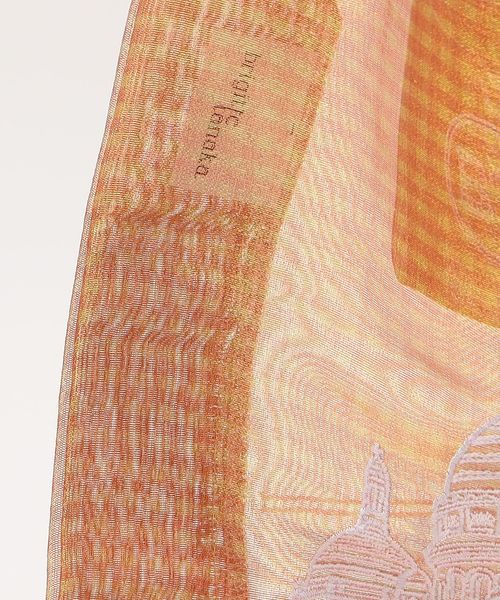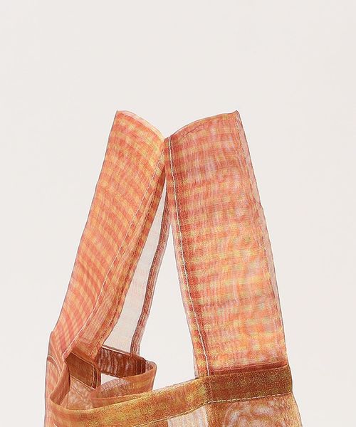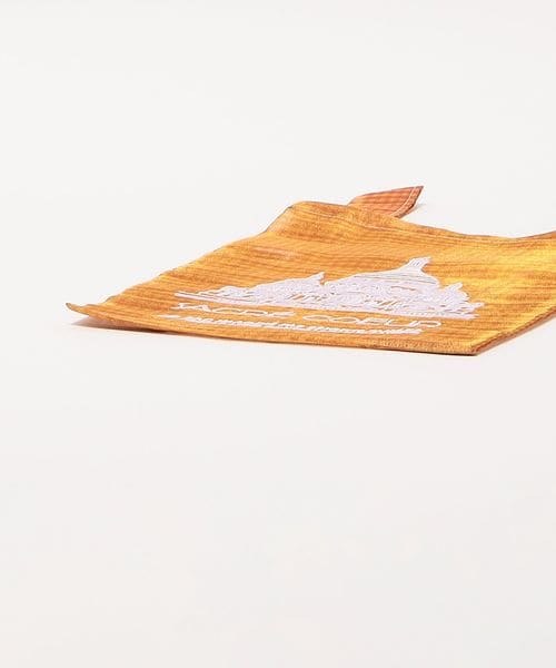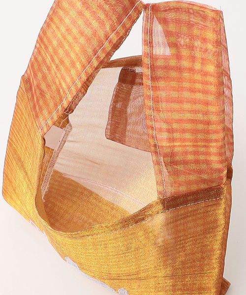 オレンジとイエローのギンガムチェック柄に寺院のモチーフが刺繍されたトートバッグ。