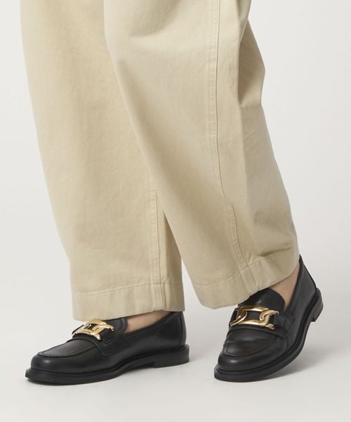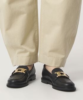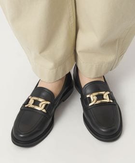サドル部分に施したチェーンモチーフのメタルオーナメントが目をひくローファー。