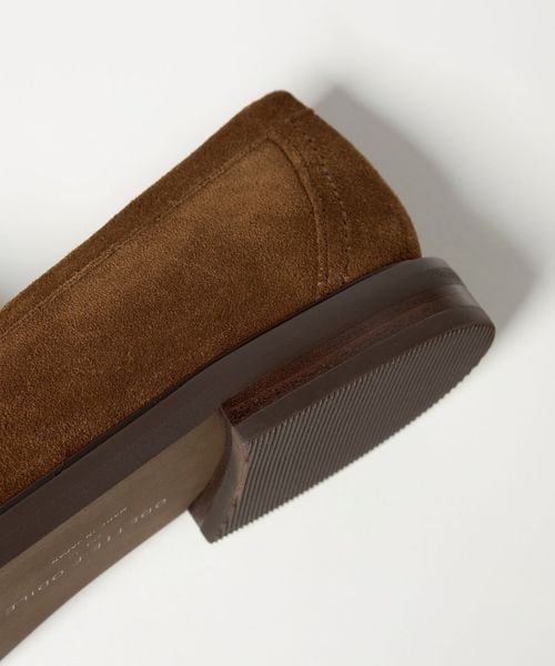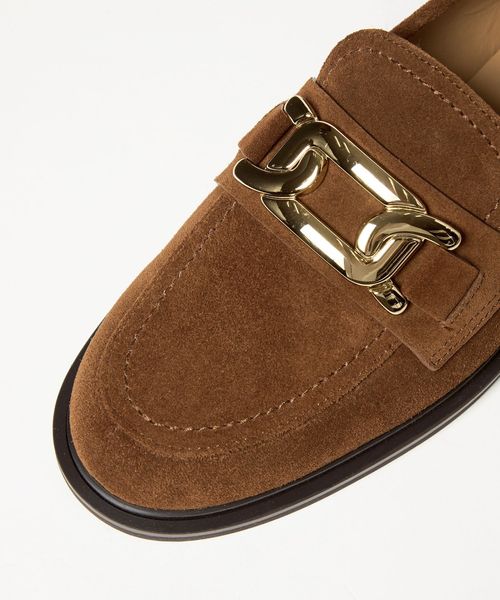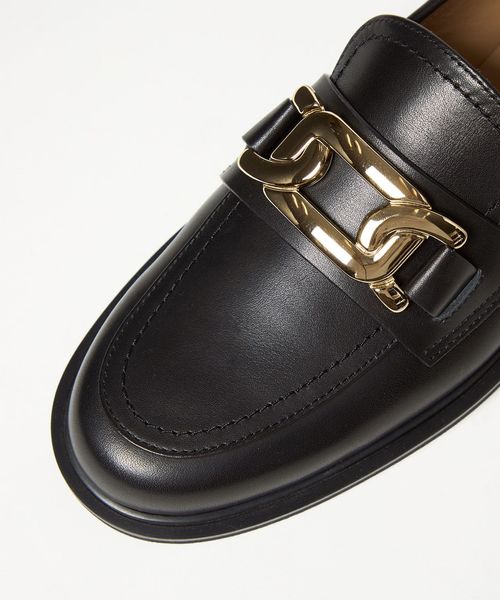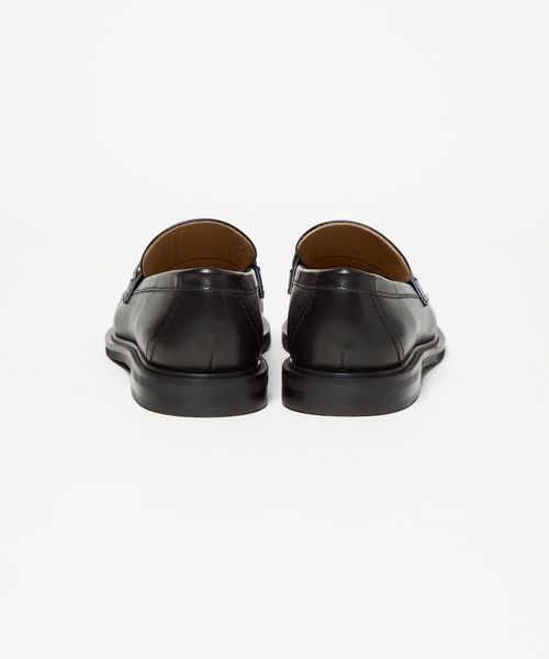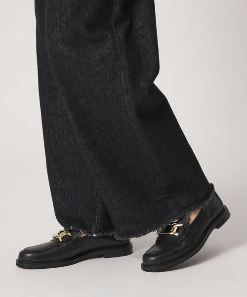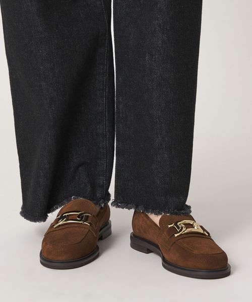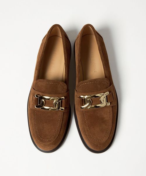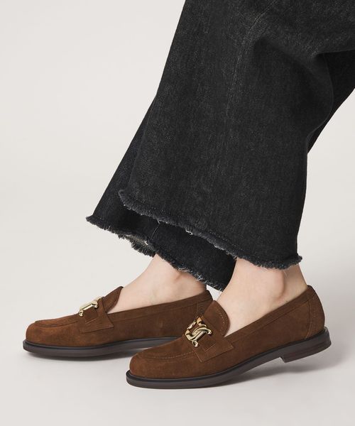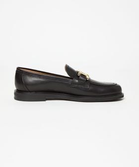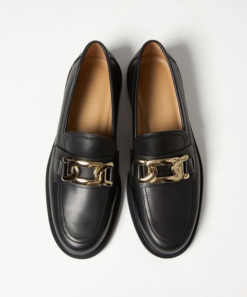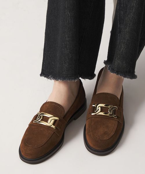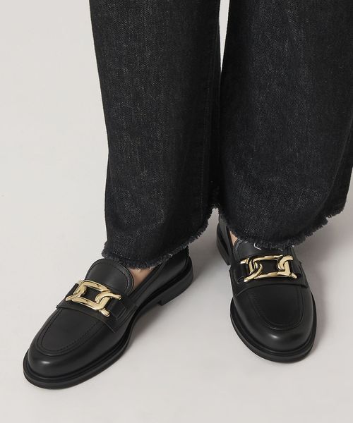 サドル部分に施したチェーンモチーフのメタルオーナメントが目をひくローファー。