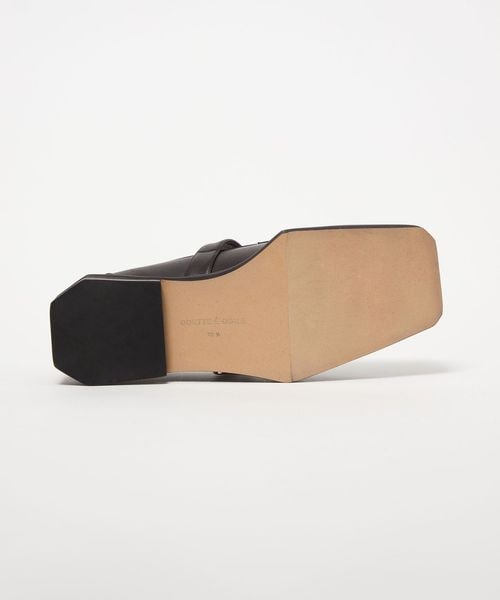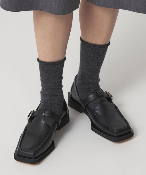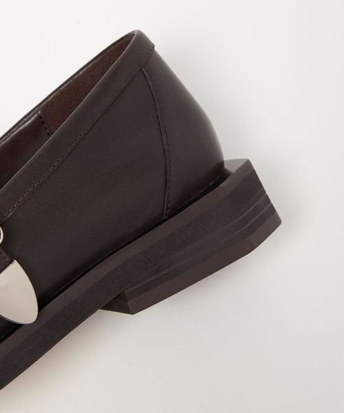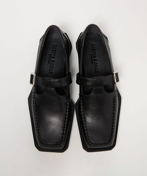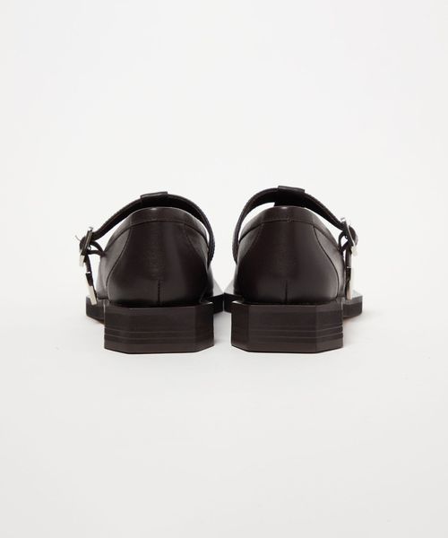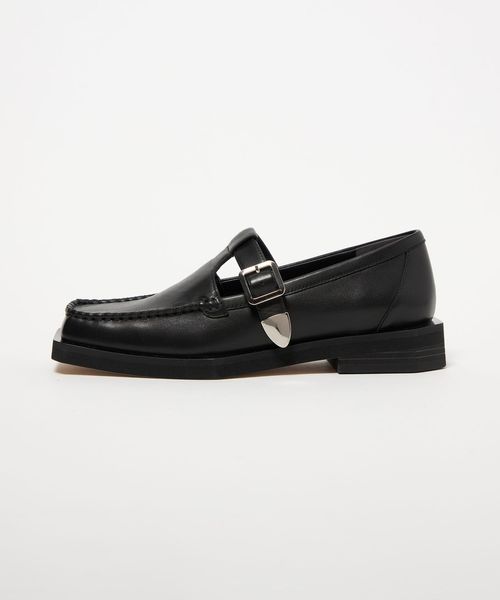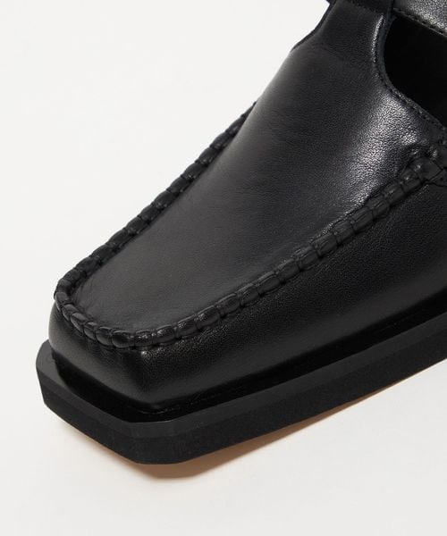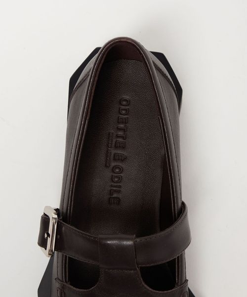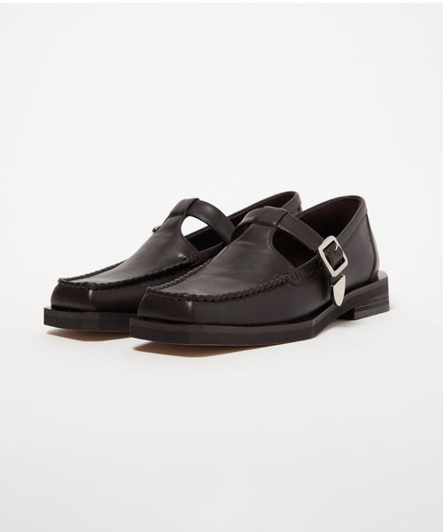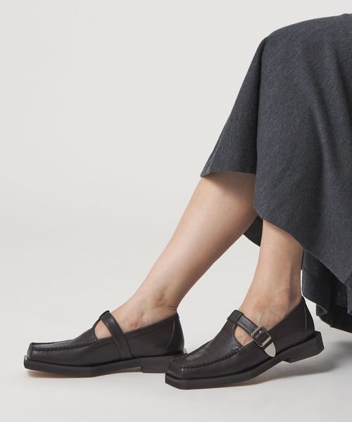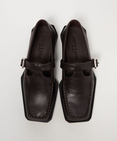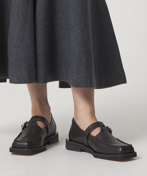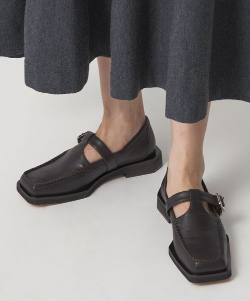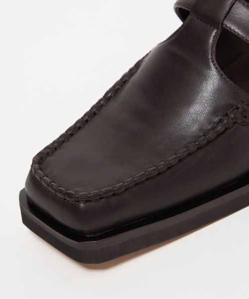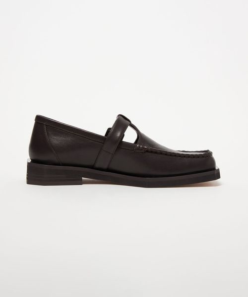 ボクシーなトゥラインに外側に張り出した押縁を組み合わせたTストラップモカ。