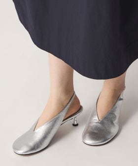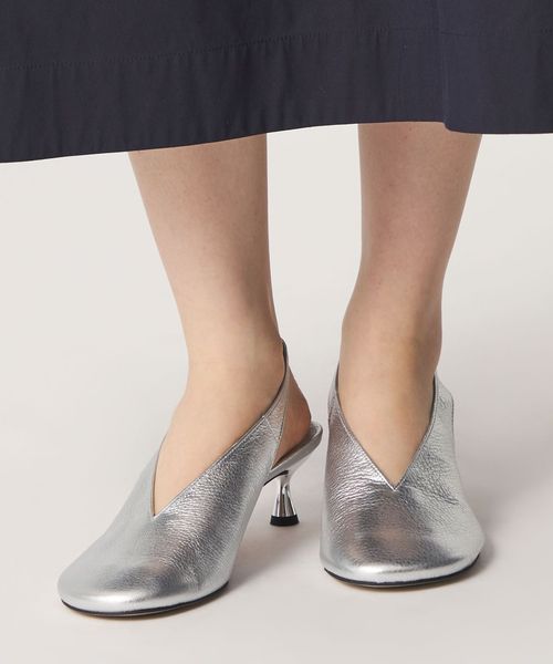 オブリークなラウンドトゥに深めのVカットが印象的なバックベルトパンプス