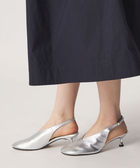 華奢な約5cmのヒールは光沢感のある素材で、アッパーとのコントラストがモダンな印象。