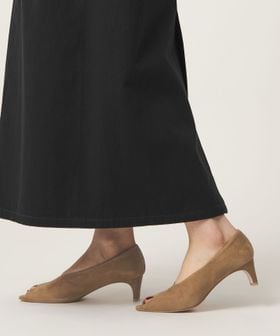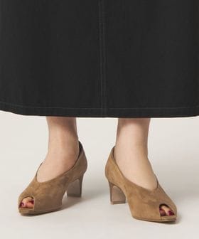 細めのスクエアトゥでつま先が小さく開いたピープトゥのパンプス。