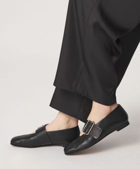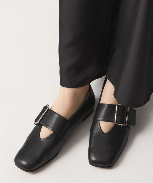 深めの履き口にワイドな甲ベルトとアイコニックなバックル金具を付け、シンプルながらもモード感あふれるデザイン。