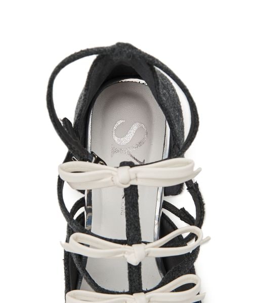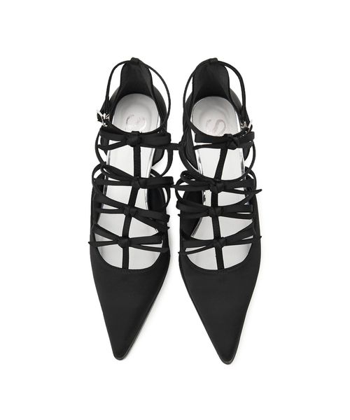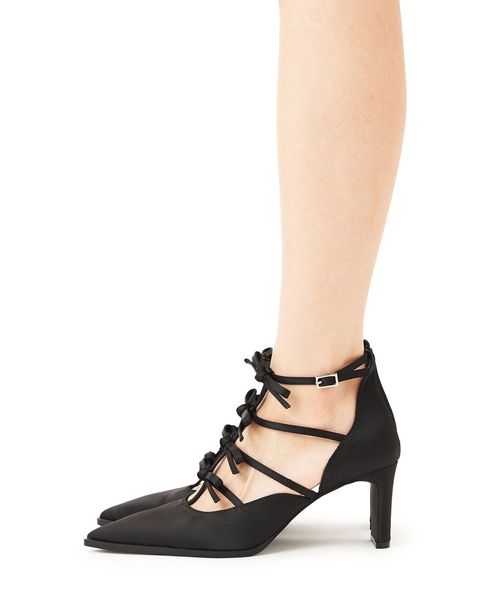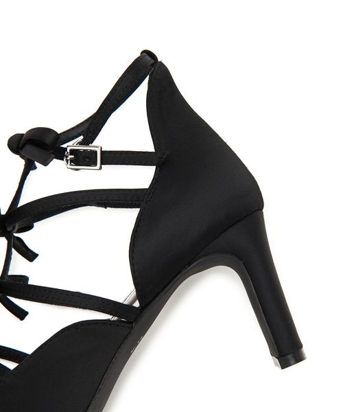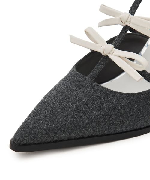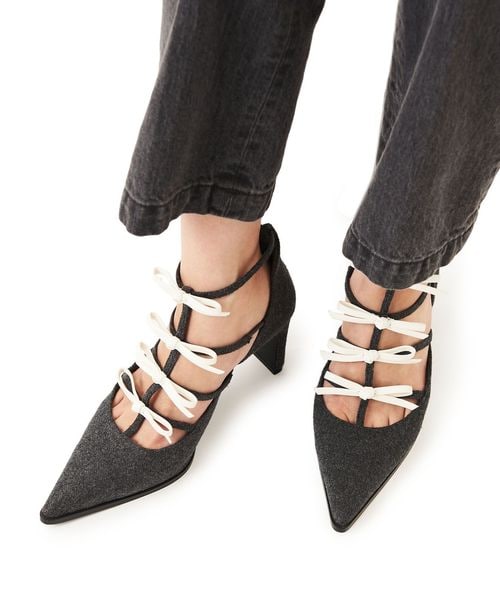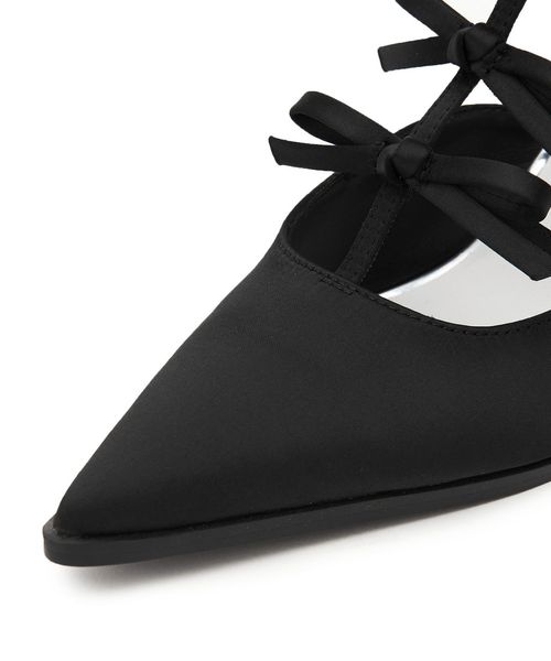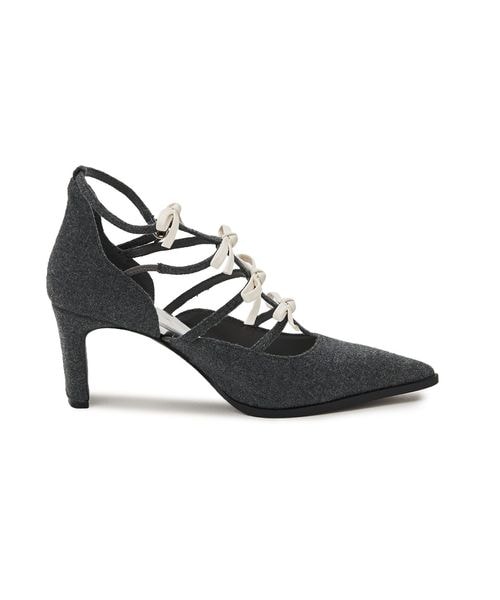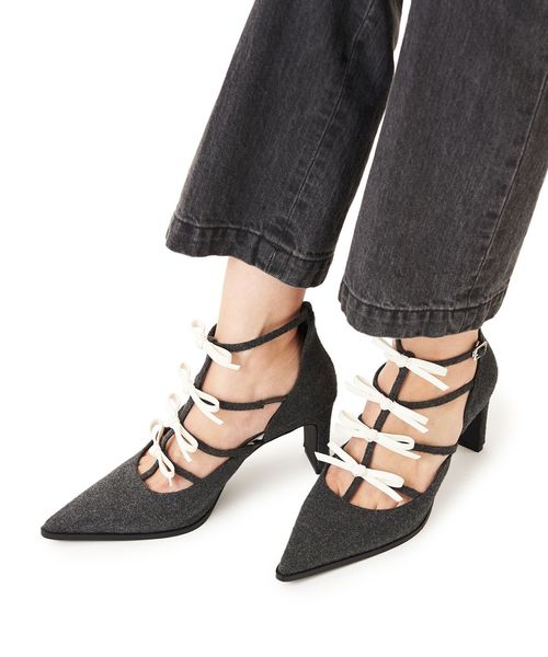 センターラインにリボンを施した存在感のあるストラップ付きパンプス。