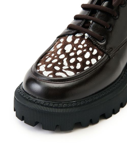 その他1カラーはダークブラウンのスムース素材と、茶系のハラコ風生地にシルバーの斑柄プリントのコンビ。