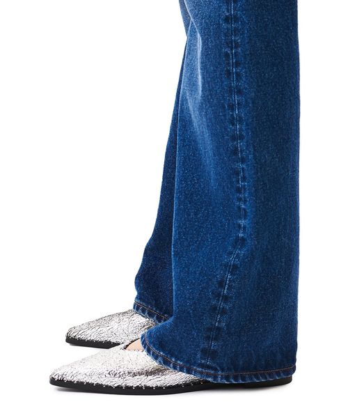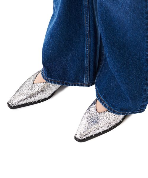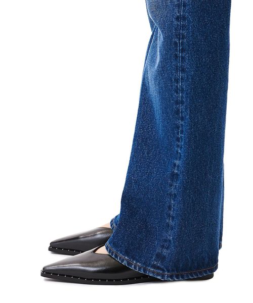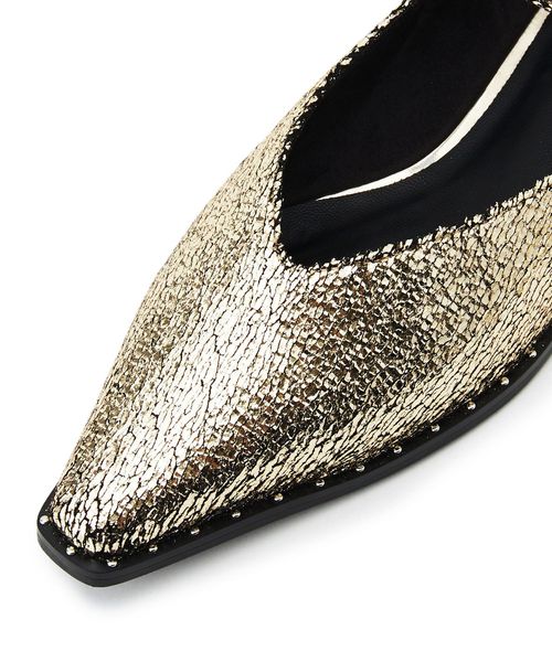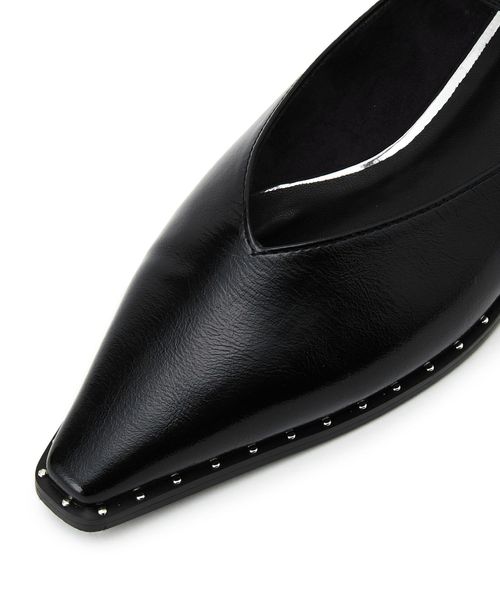 Vカットの履き口と細めのスクエアトゥがモードな雰囲気を漂わせ、周りに施された小さめのスタッズがスパイスをプラスします。