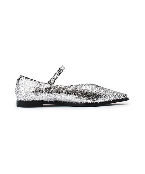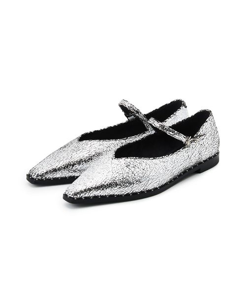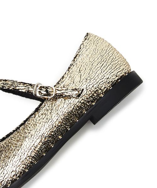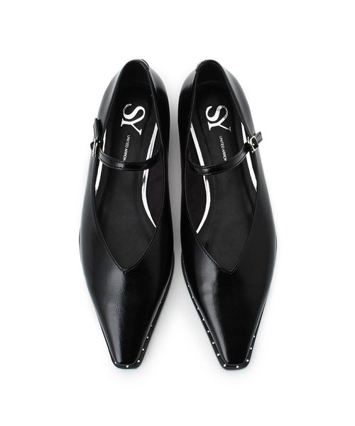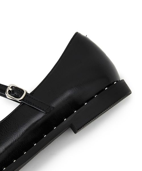 底周りのスタッズが目をひく甲ベルト付きのフラットシューズ