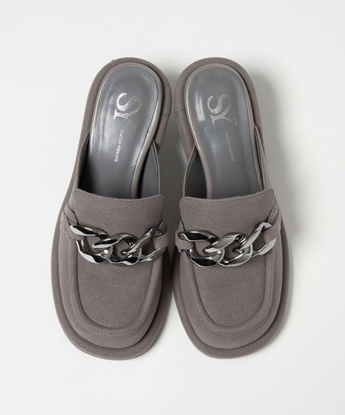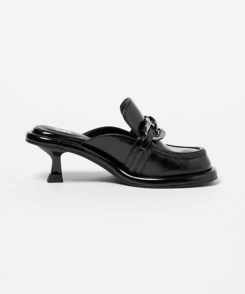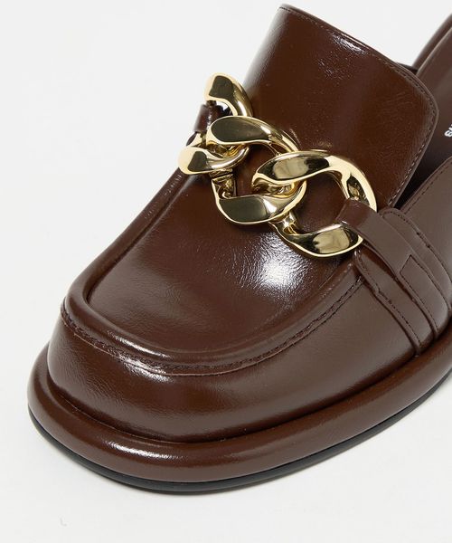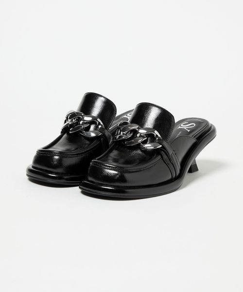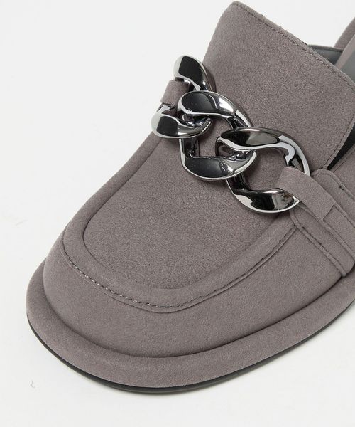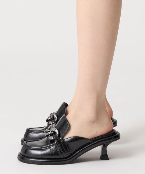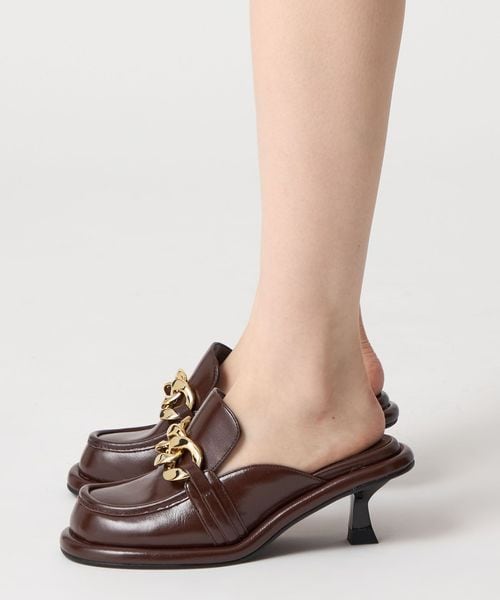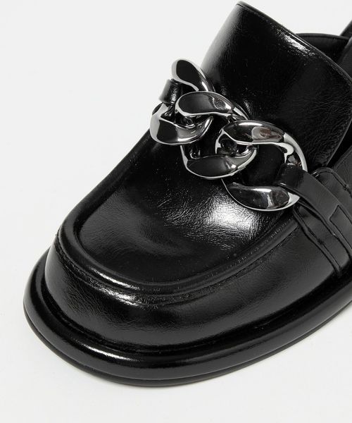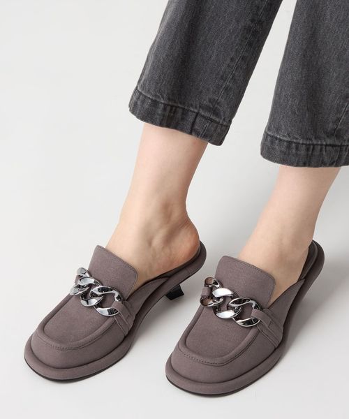 大ぶりのチェーンとローファーデザインが新鮮な印象を与えるミュール。