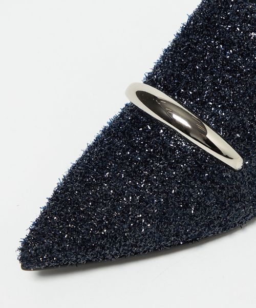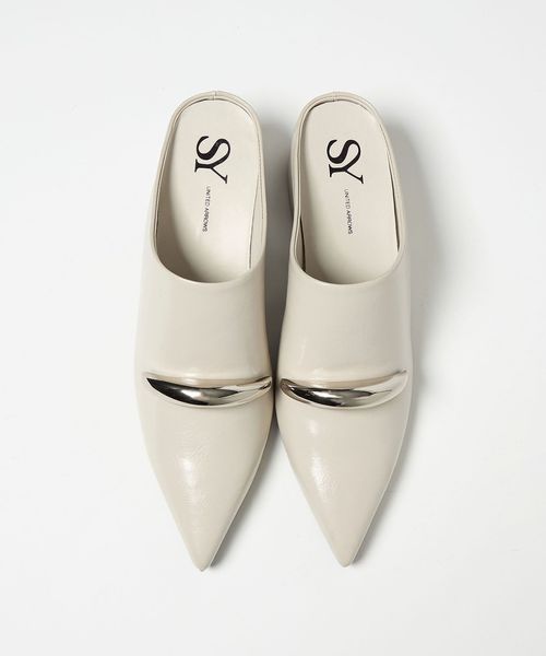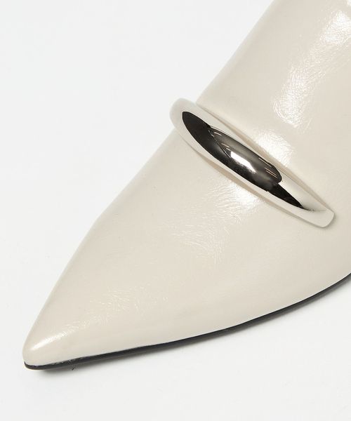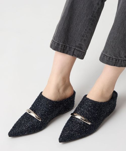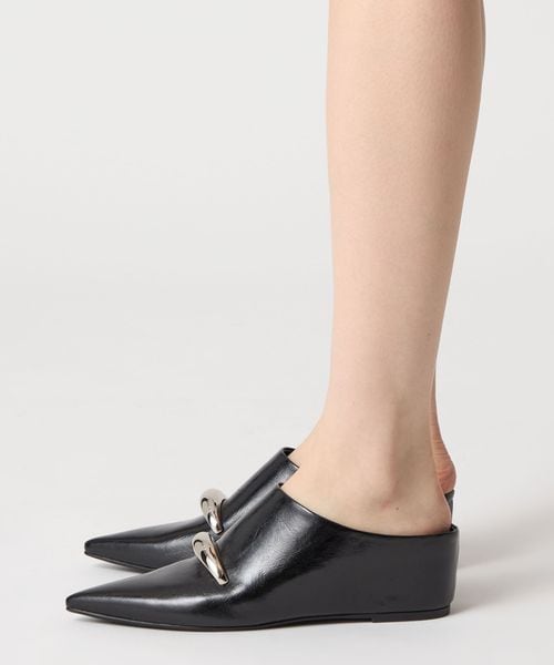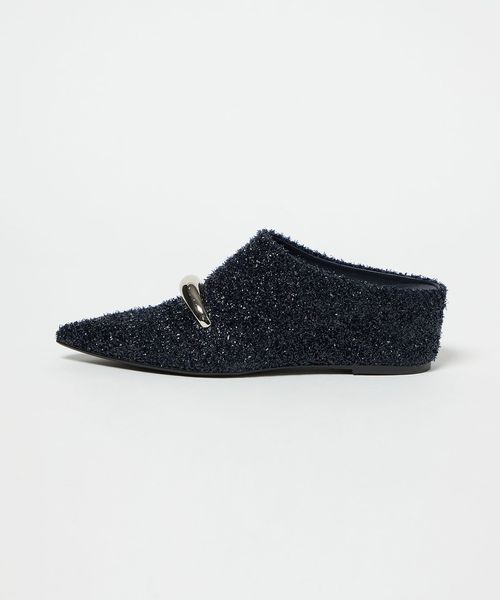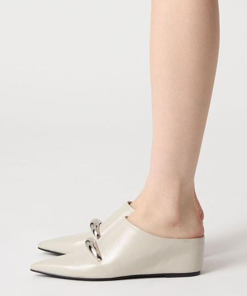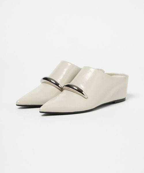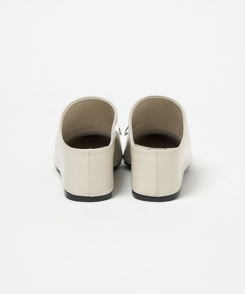 シルバーカラーのモチーフが目を惹くインヒールのウェッジミュール。