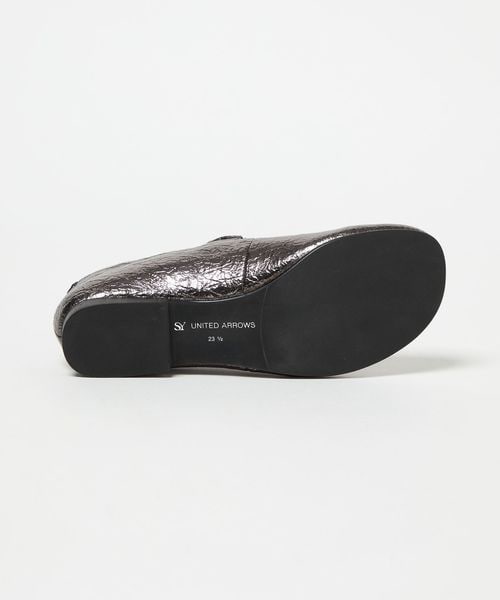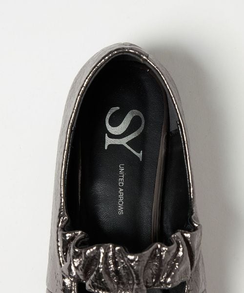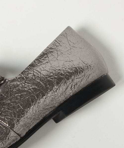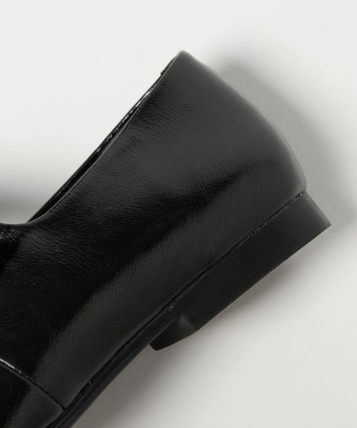 オブリークトゥとシャーリングの太めな甲バンドが女性らしさを演出するフラットシューズ。