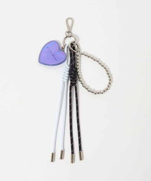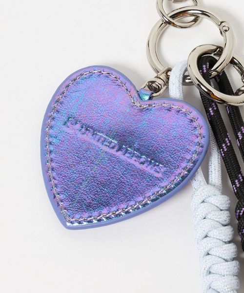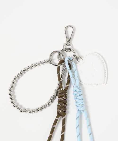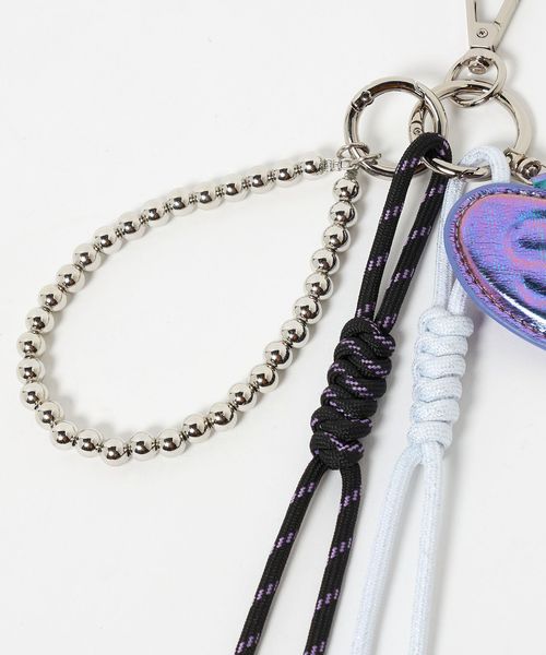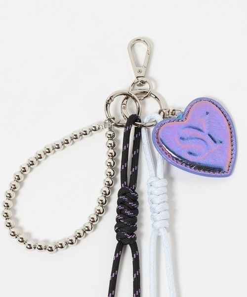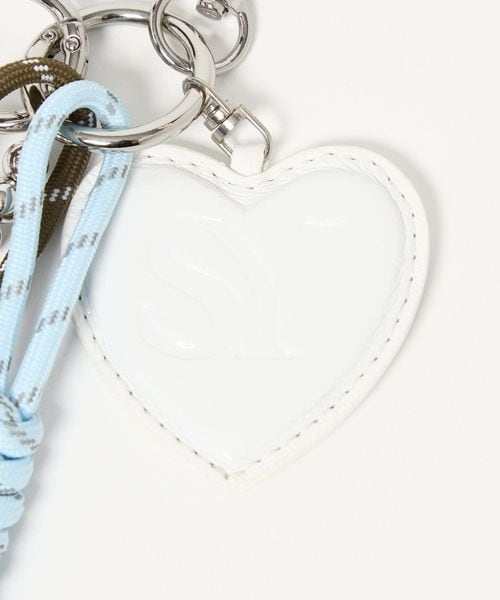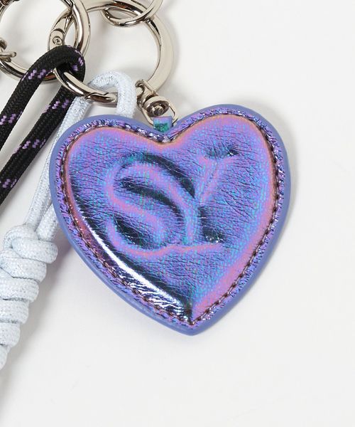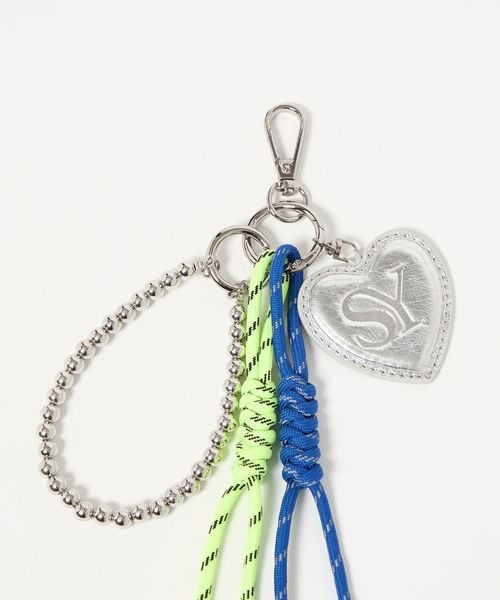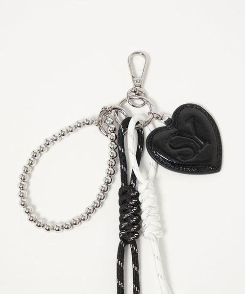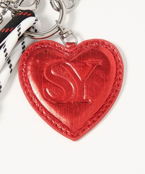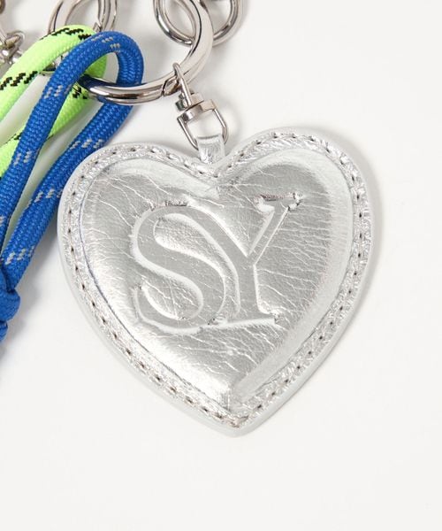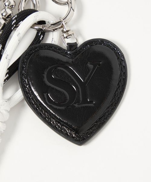 異なる2色の紐、ボールチェーン、凹凸感のある<SY>のロゴをさりげなく入れたハートモチーフの組み合わせ。