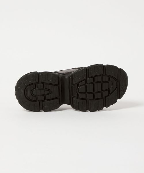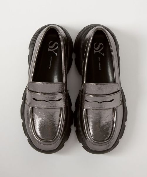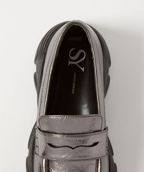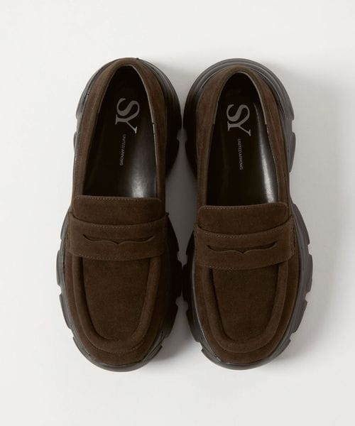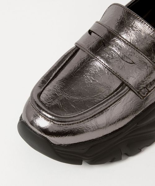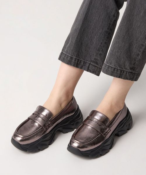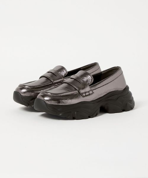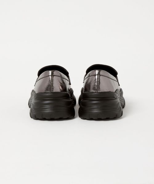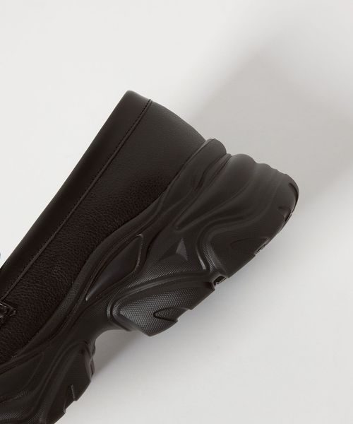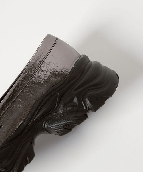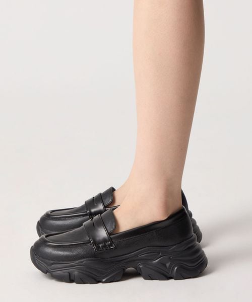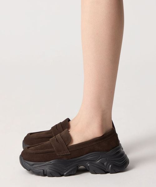 ダッドスニーカーのような厚みのあるソールに、ローファーデザインのアッパーを融合したフラットシューズ。