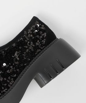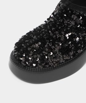 全体に縫い付けられた贅沢なスパンコールが動くたびにきらきらと輝く、華やかでトレンド感のある一足です。
