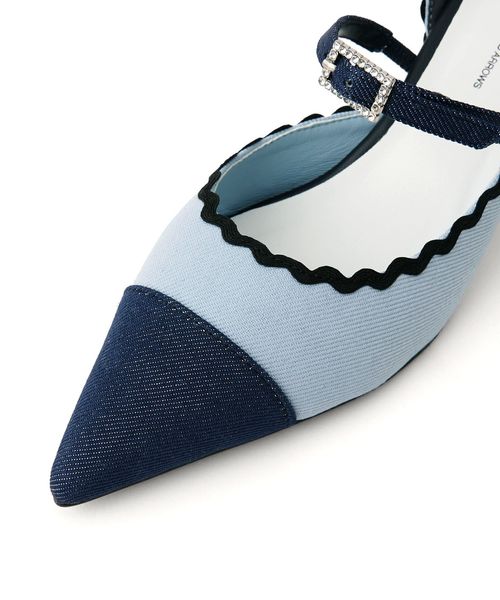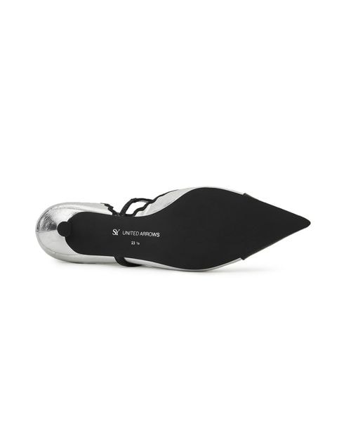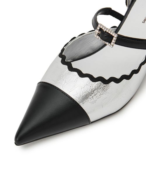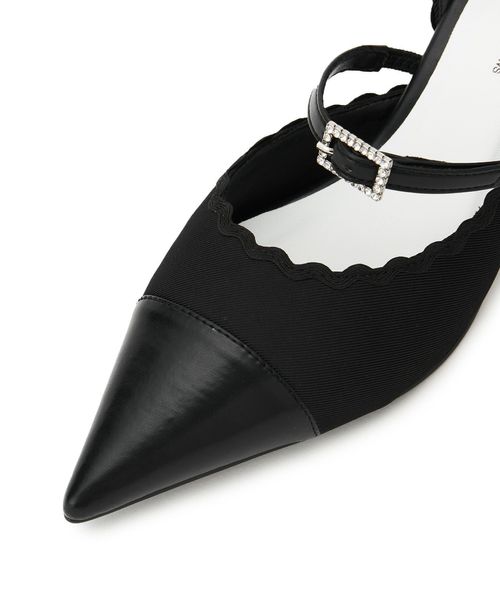 甲ベルトに施されたビジュー付きの金具やメタルパーツのヒール、つま先の切り替えなどが視線を集めるポイント。