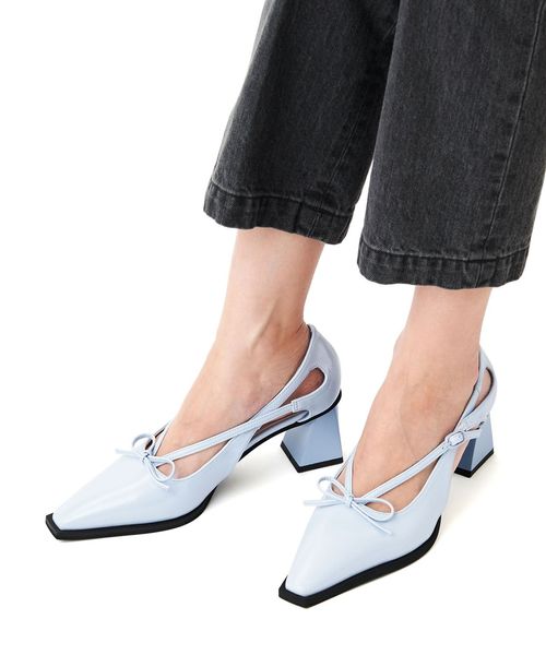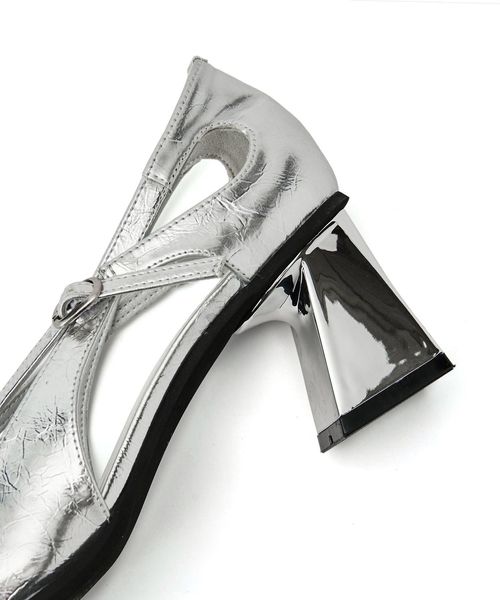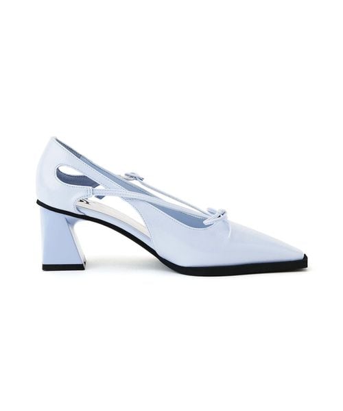 複雑に交差したストラップが目をひき、サイドに大胆な開きを加えたデザインのパンプス。