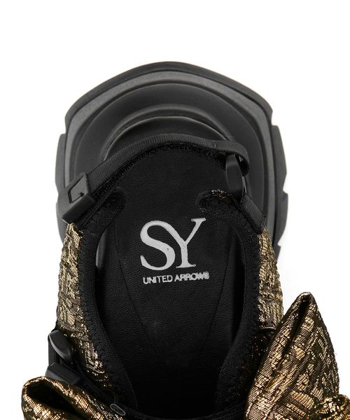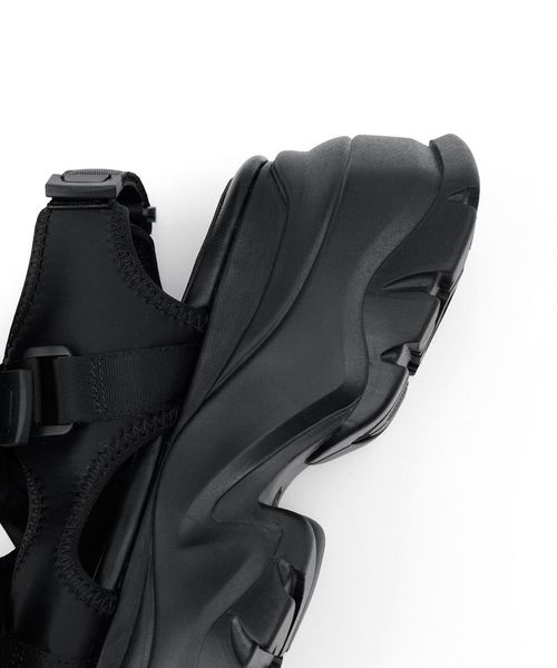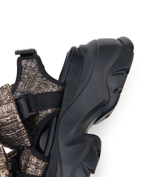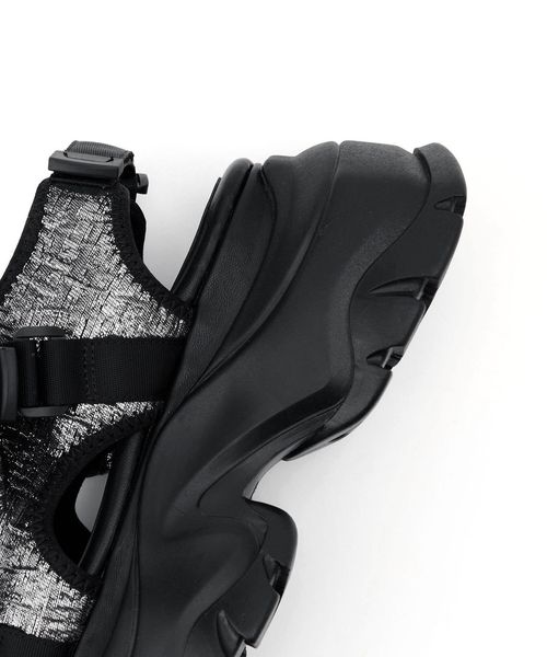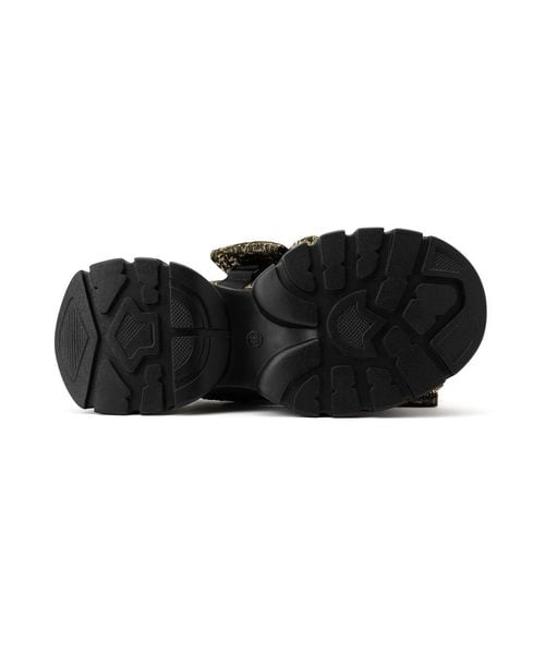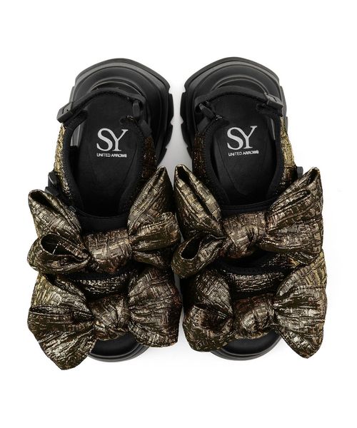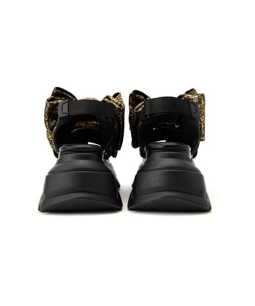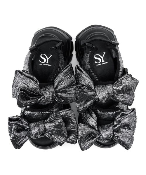 甲を大胆に覆う大きなリボンと、厚みのあるソールが特徴のサンダルです。