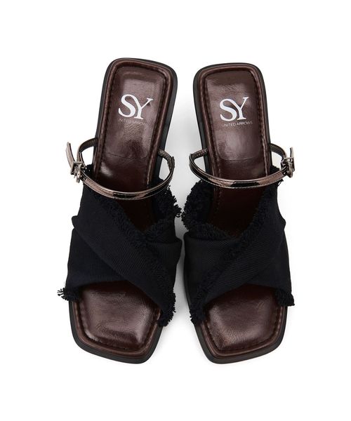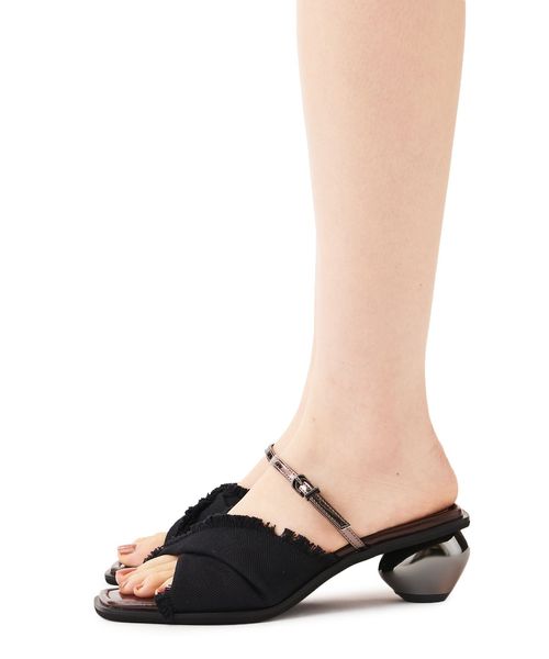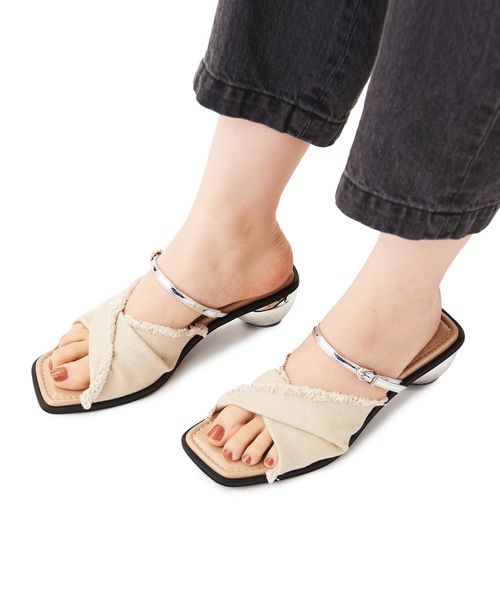 フリンジ生地をひねったような立体感のあるクロスベルトが印象的なサンダル。
