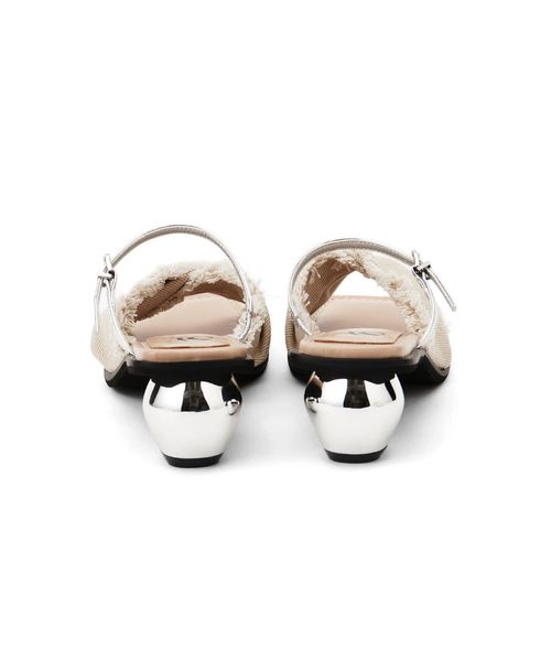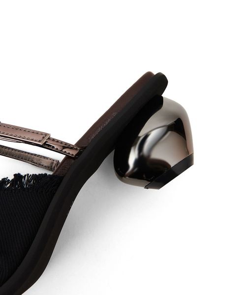 カジュアルな素材ながら、メタリックの甲ベルトやメッキ加工の変形ヒールで都会的なモード感をプラス。