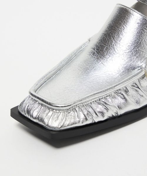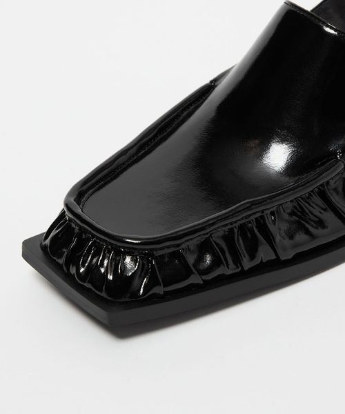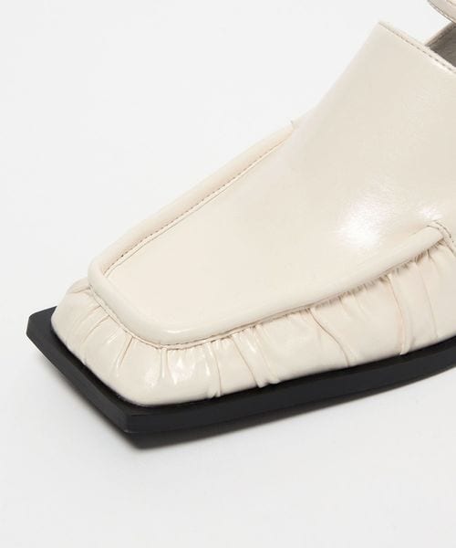 ギャザーデザインのトゥ先が印象的な一足。