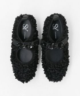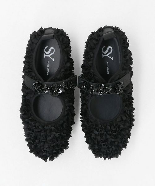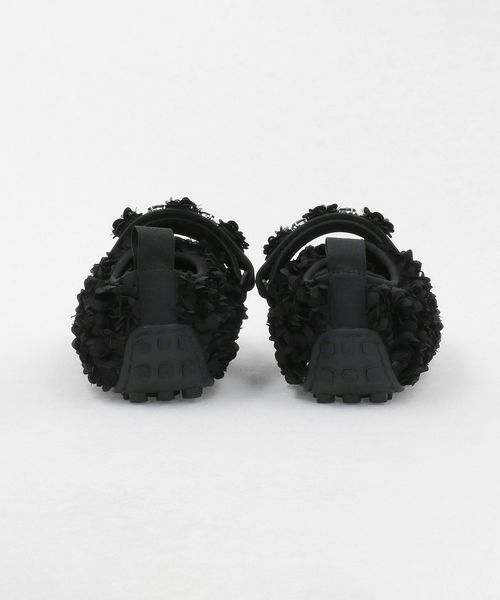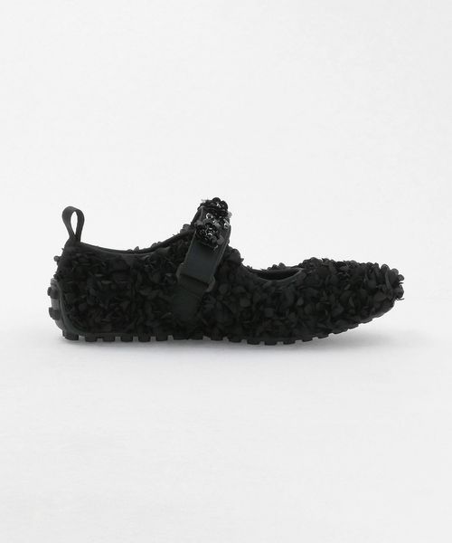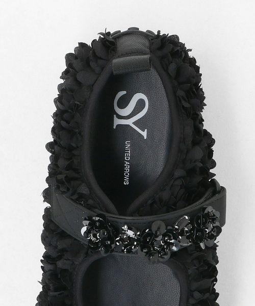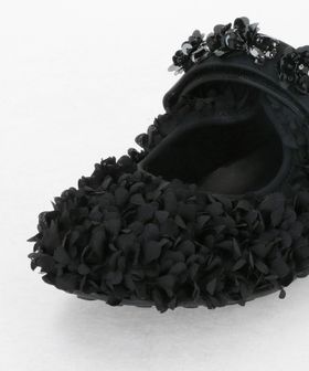 ベルクロタイプの甲ベルトにビジューとスパンコールでつくった花モチーフをあしらった一足。