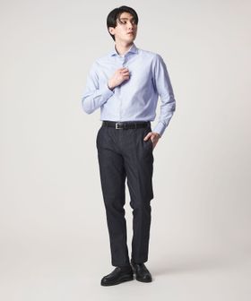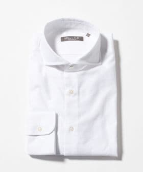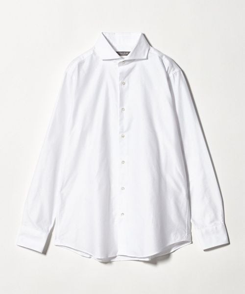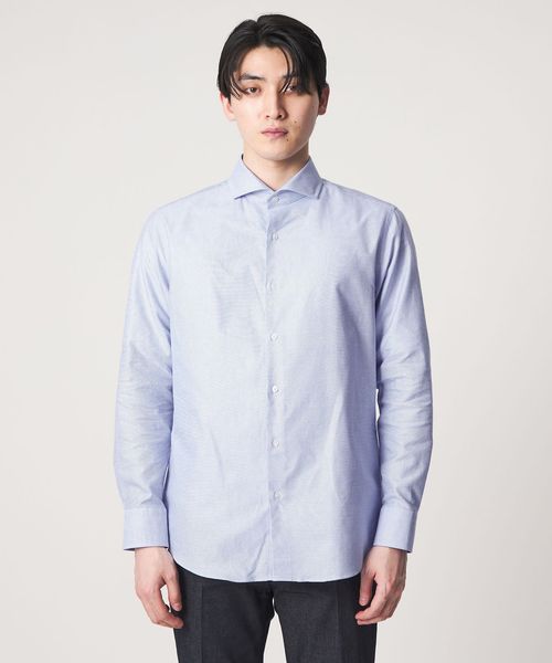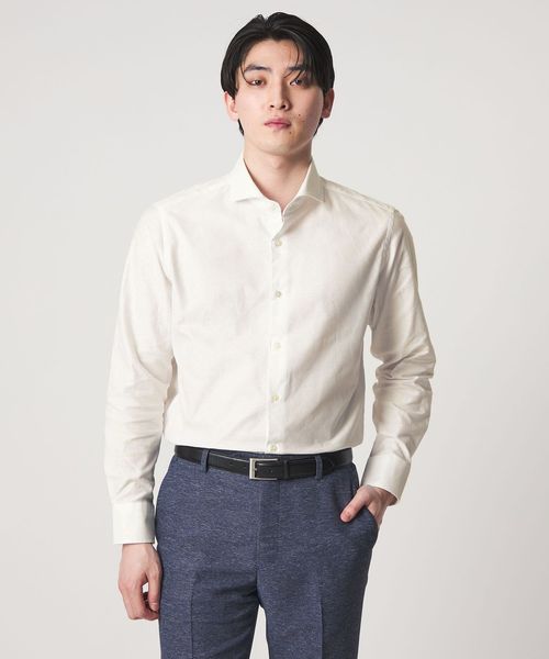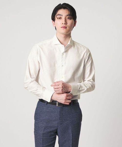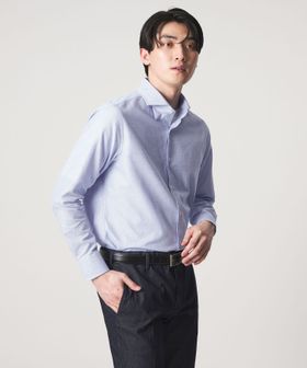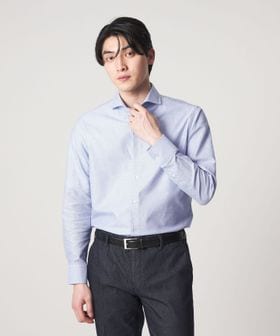 顔まわりをすっきりと見せるカッタウェイカラーを採用しており、ノーネクタイでもバランスよく決まるデザインです。