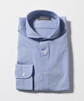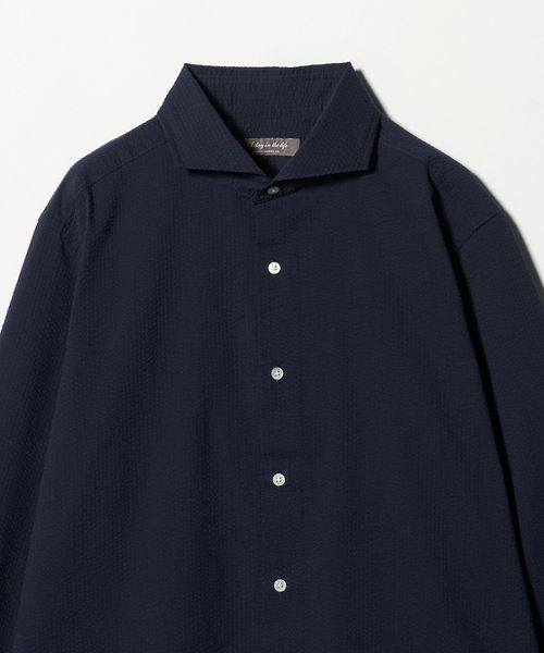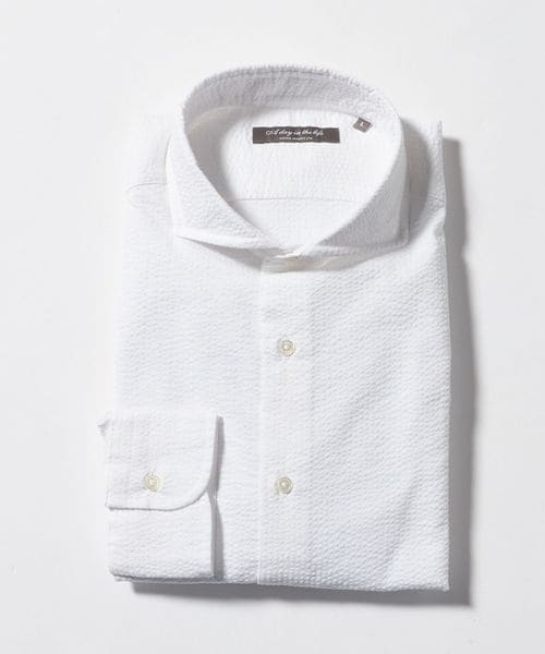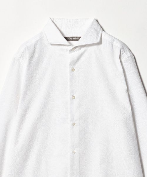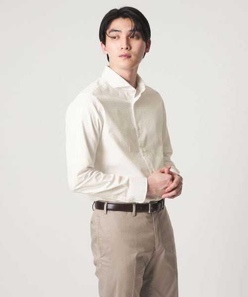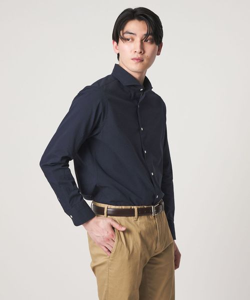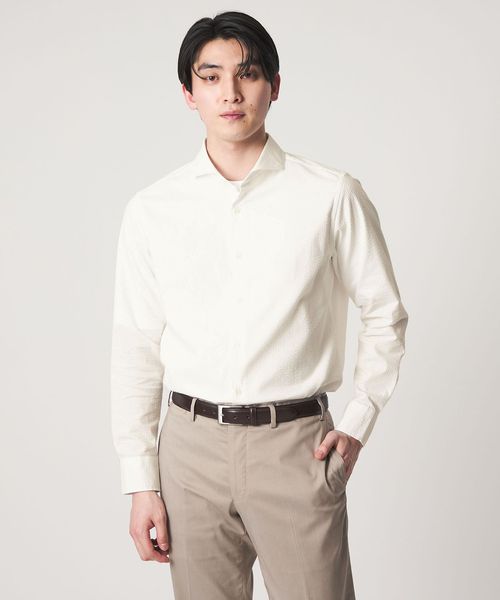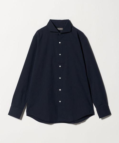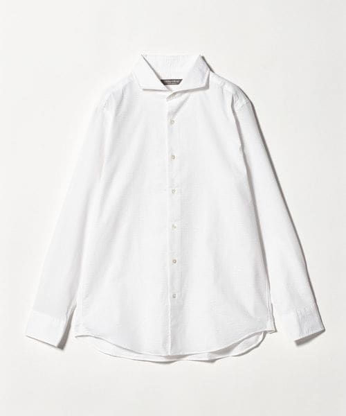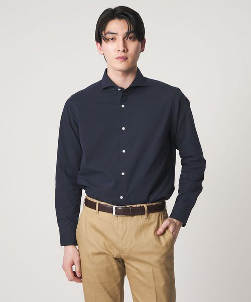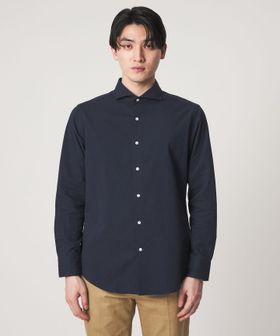顔まわりをすっきりと見せるカッタウェイカラー を採用した長袖シャツ。