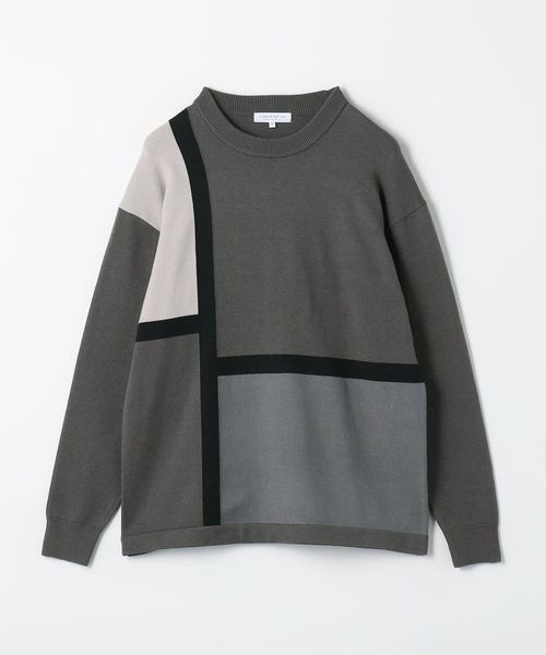 アシンメトリーなカラーブロックデザインがモードな雰囲気のニットプルオーバー。