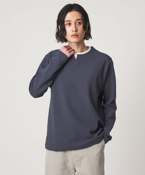 キーネック×クルーネックの絶妙なバランスが、シンプルながらも印象的なスタイルに仕上げています。