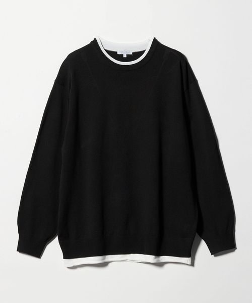 ネックと裾の配色がアクセントになった、レイヤード風デザインのニット。