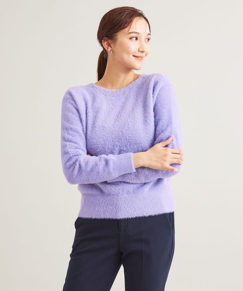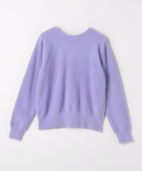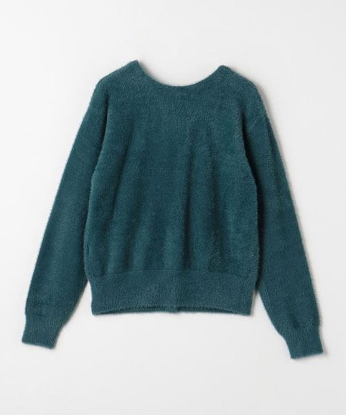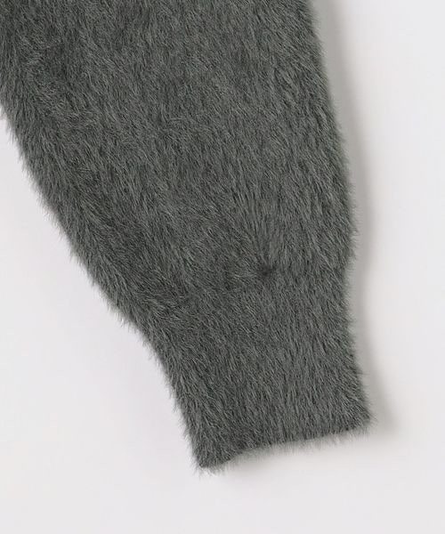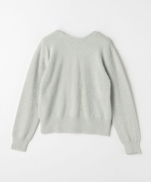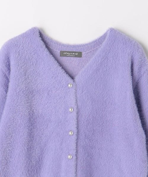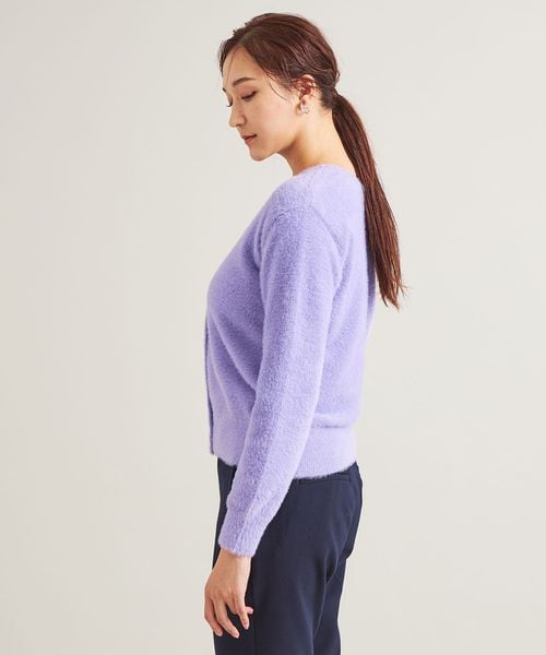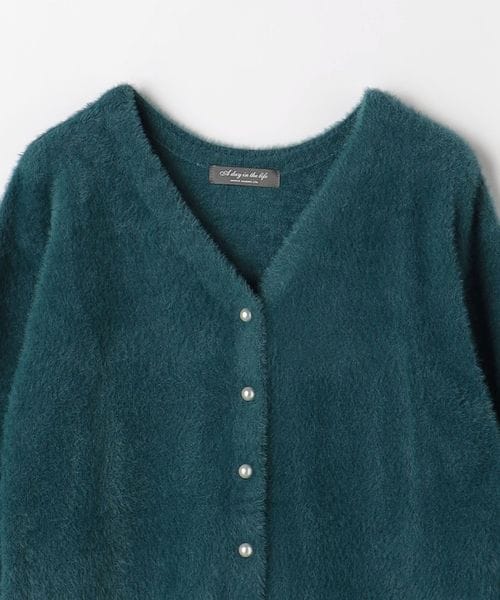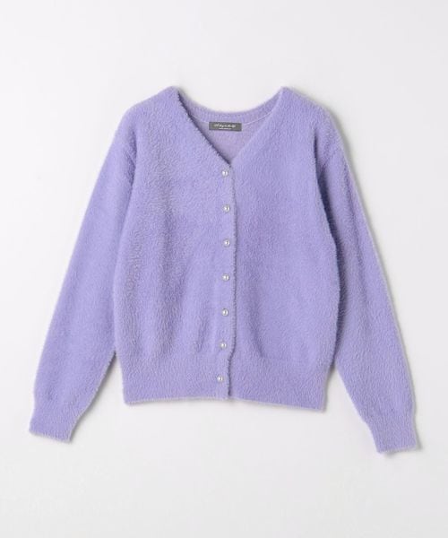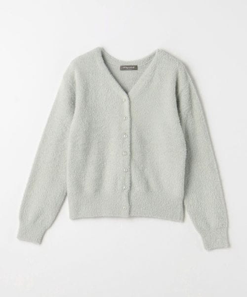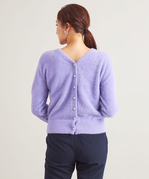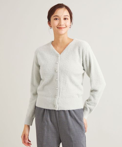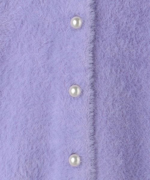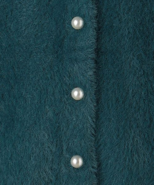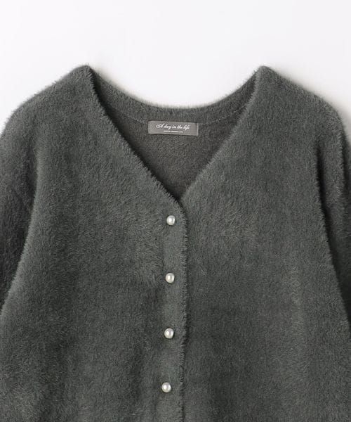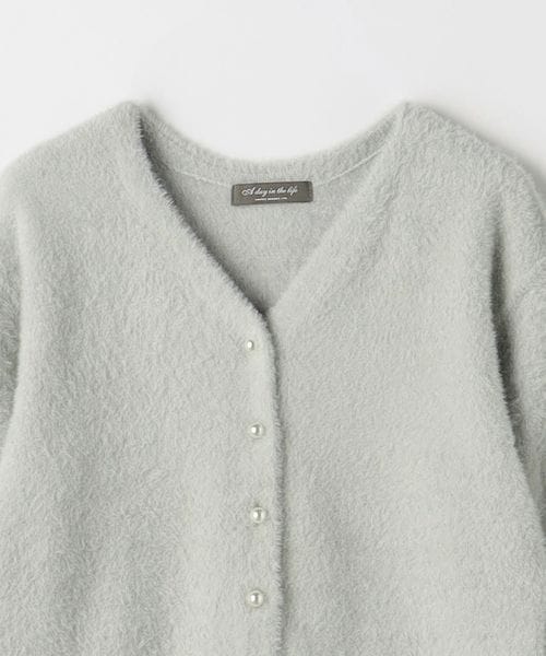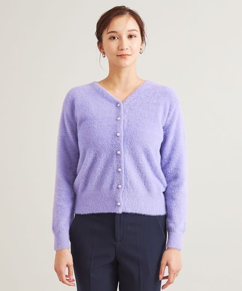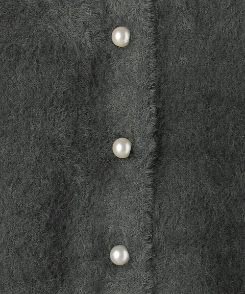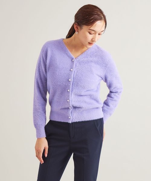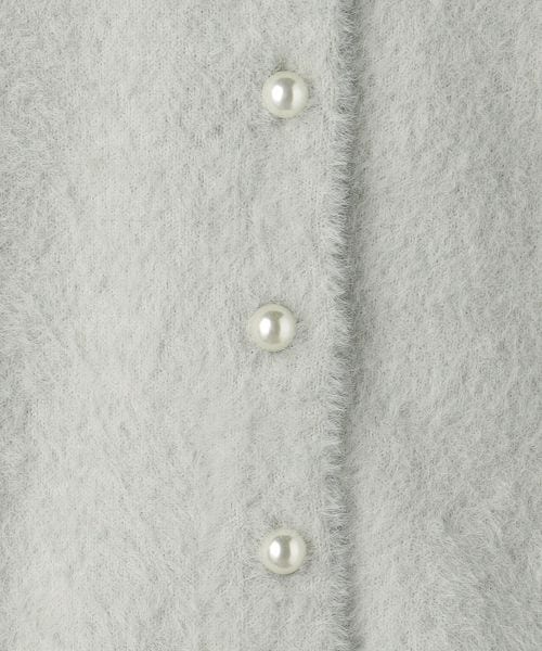 ふんわりとしたフェザー素材を使用した、フェイクパールボタンがアクセントのカーディガン。