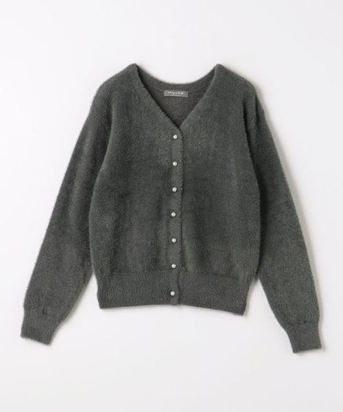 ふんわりとしたフェザー素材を使用した、フェイクパールボタンがアクセントのカーディガン。