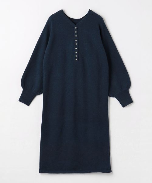 パフスリーブとフェイクパールボタンがポイントのフェミニンなニットワンピース。