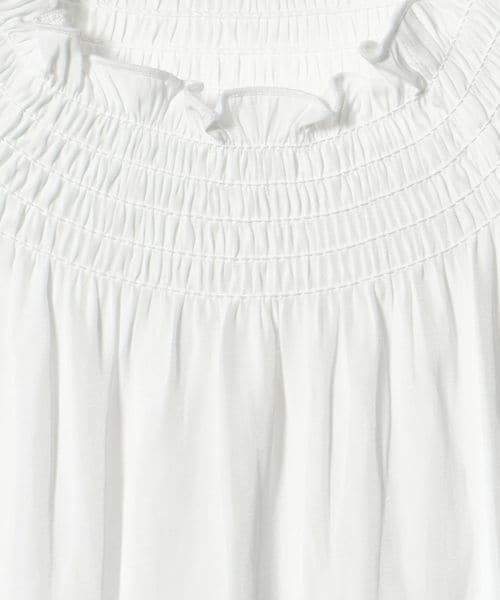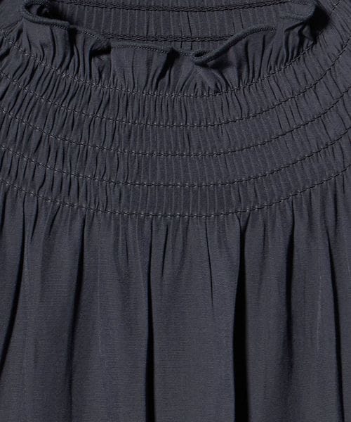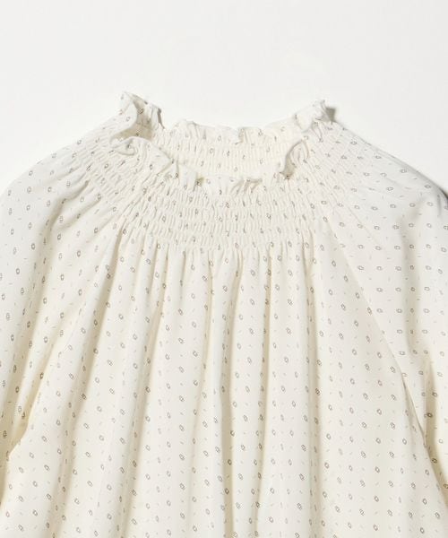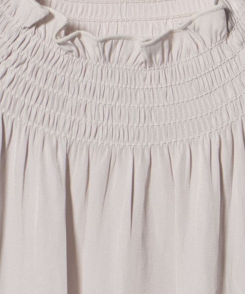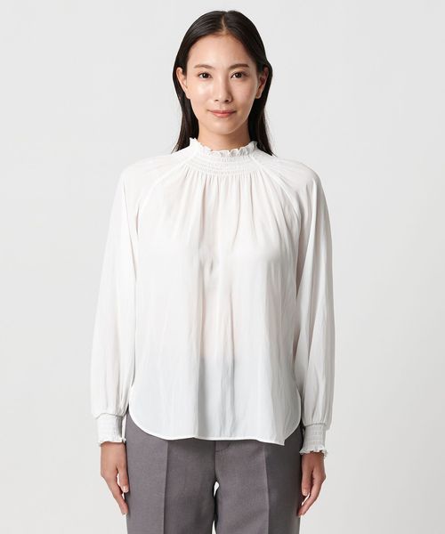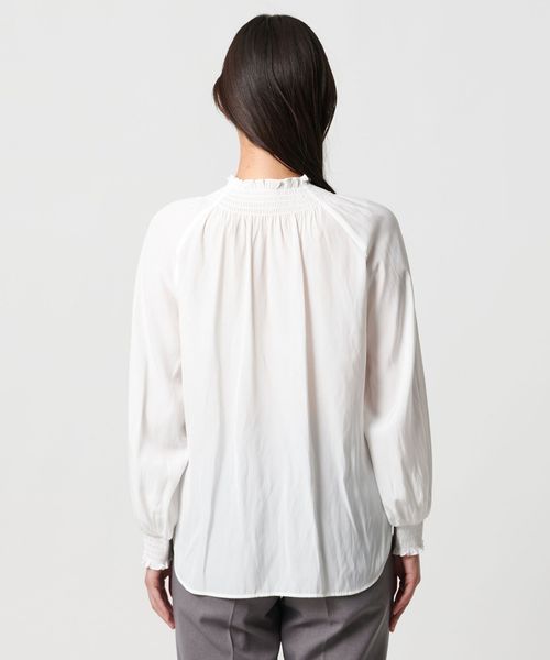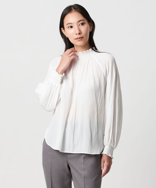 襟ぐりと袖口にシャーリングを施した華やかなブラウス。
