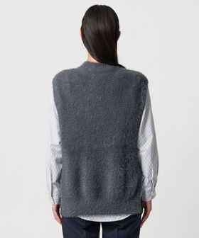 ベストは毛足の長いナイロンフェザーとラメ糸を引き揃えた畔組織。