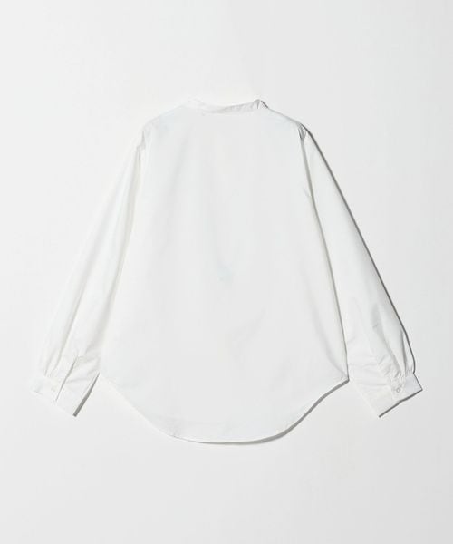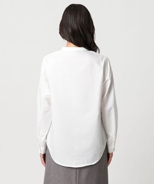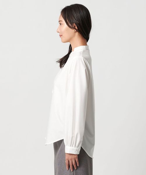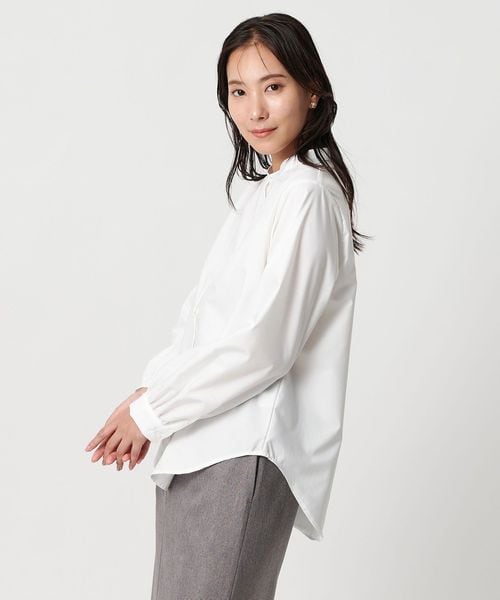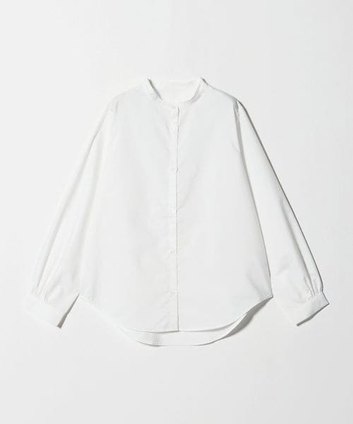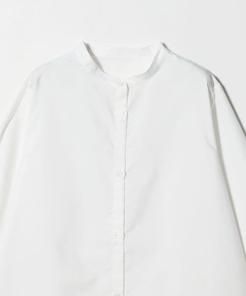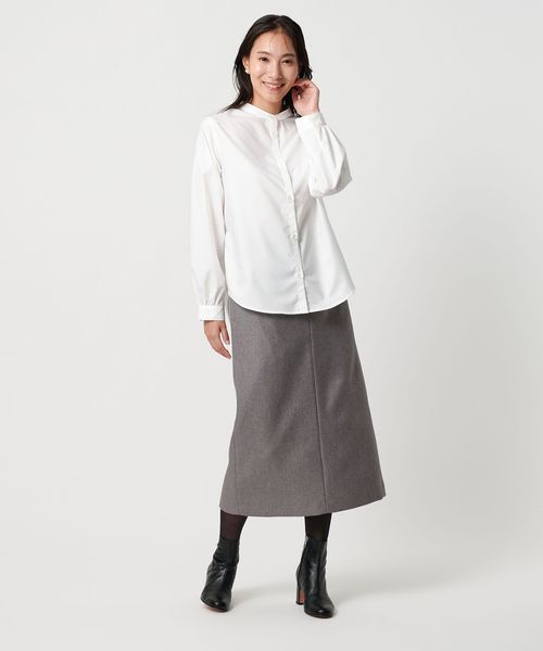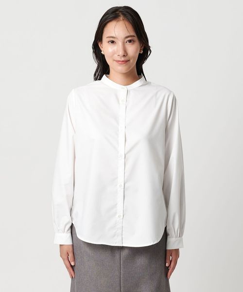 シャツはシンプルなバンドカラーで汎用性の高いデザイン。