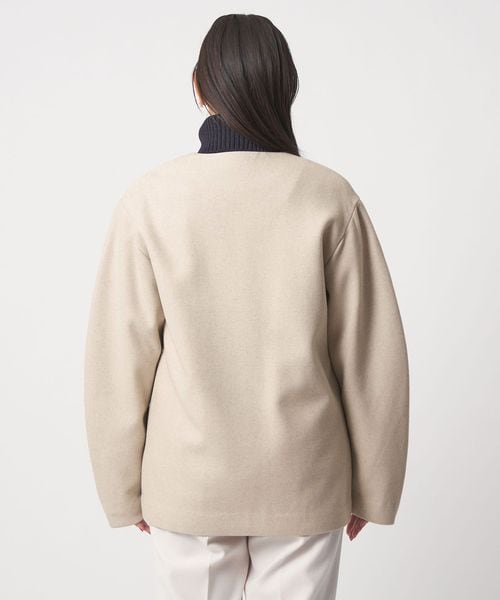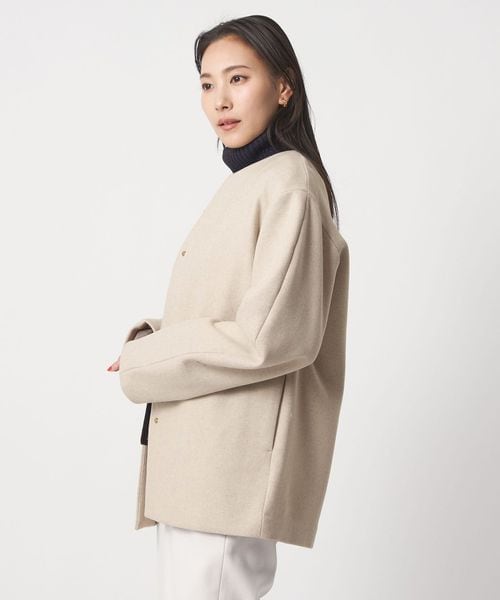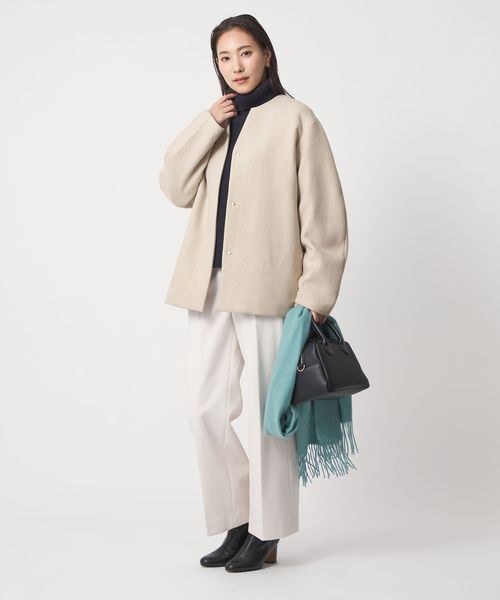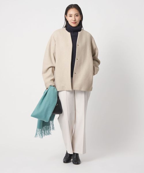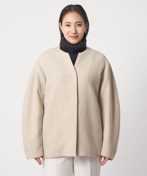 フェイスラインをすっきりと見せてくれるキーネックのショートコート。