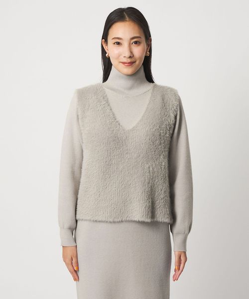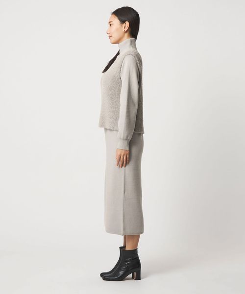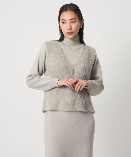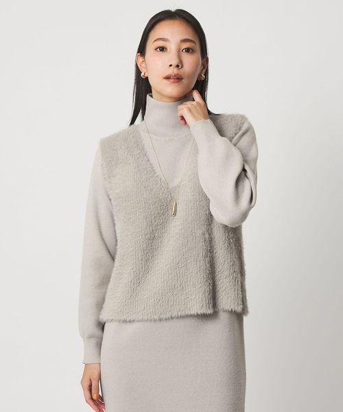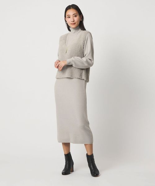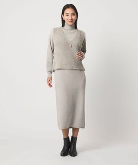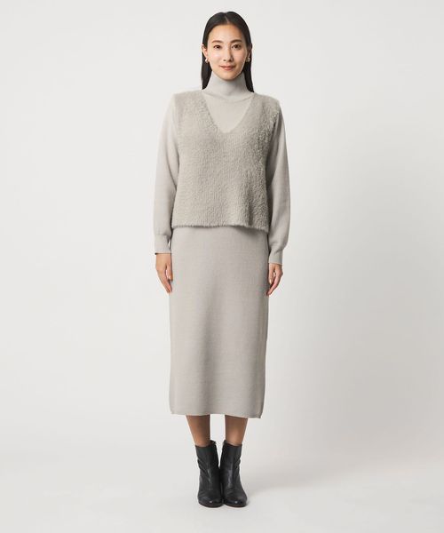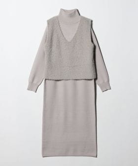 すっきりとしたスムース編みのニットワンピースと、ふんわりとしたフェザーのニットベストのセットアイテム。