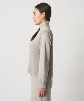 ワンピースの身頃は厚みの出るスムース、袖は天竺編みで艶感を持たせました。
