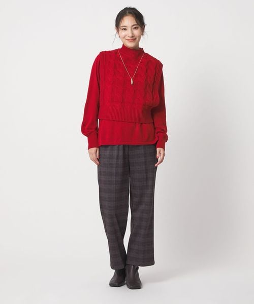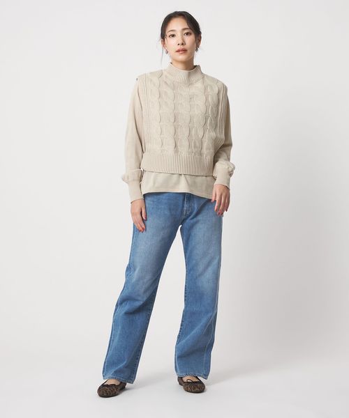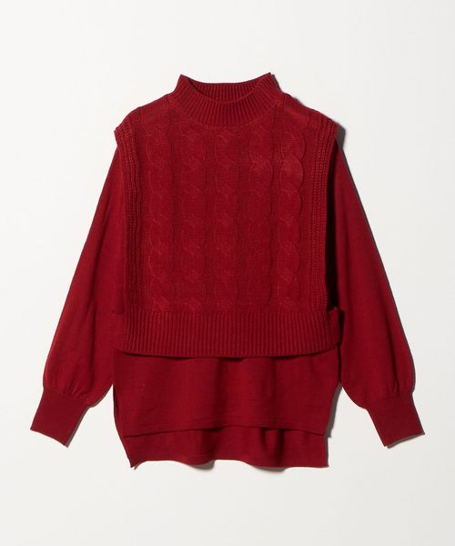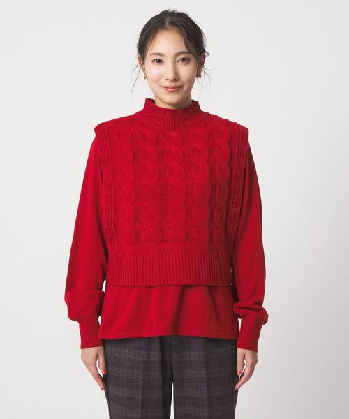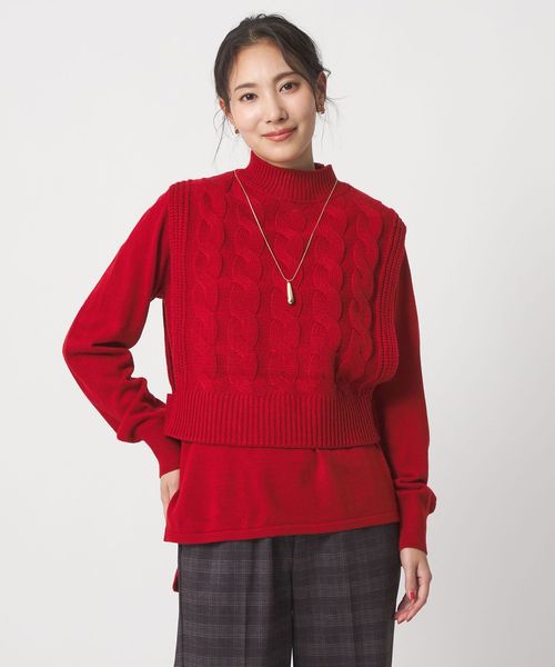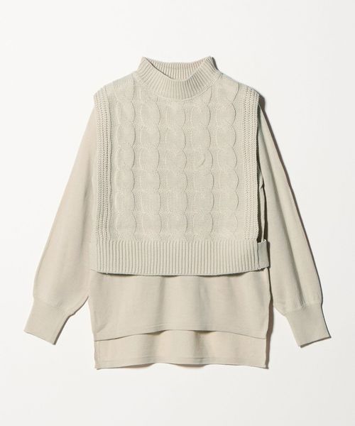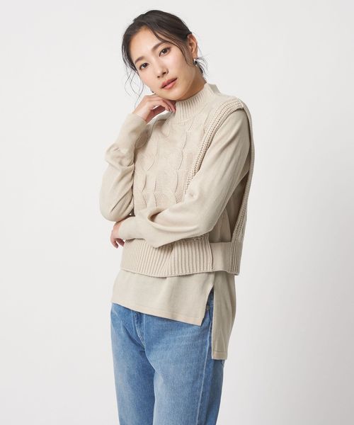 ケーブル編みのニットベストとクルーネックニットのセットアイテム。