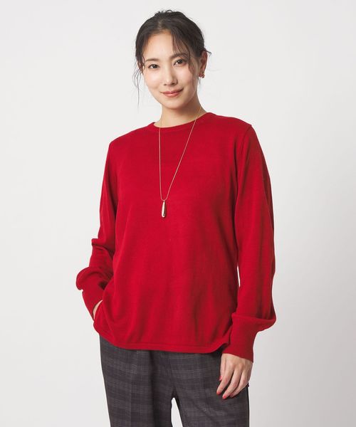 インナーのニットはベーシックなクルーネックにさりげないパフスリーブがポイント。